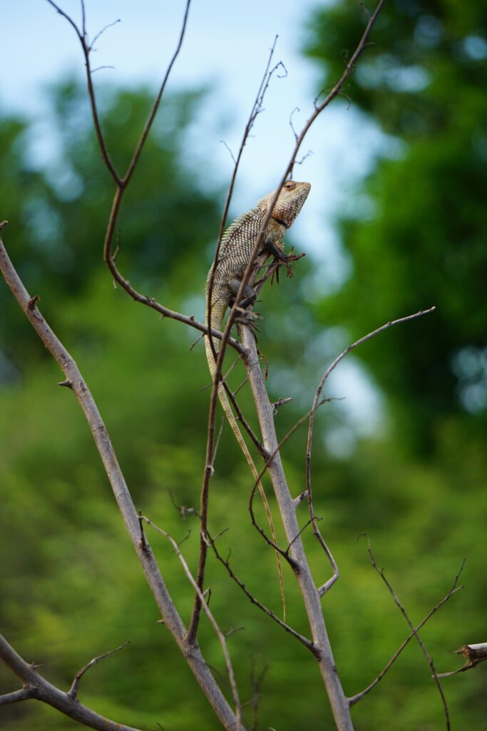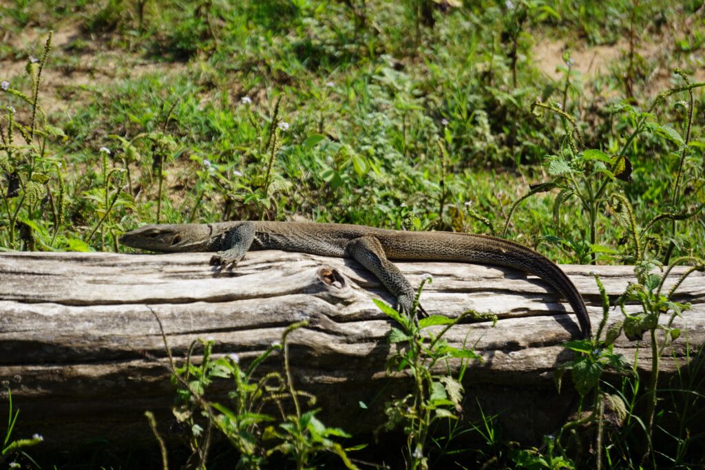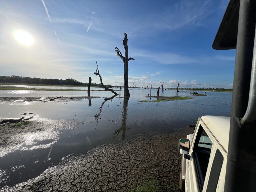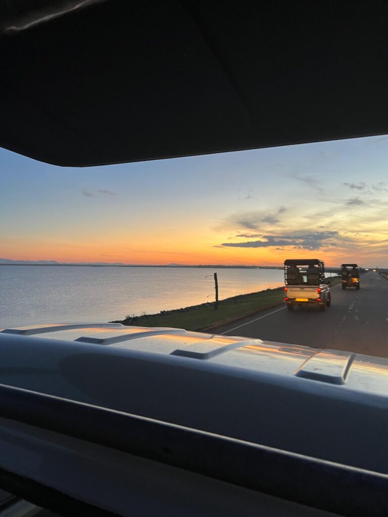 Die erste Nacht in unserem Zelt war leider nur sehr kurz. Um 4:45 Uhr klingelte nämlich schon der Wecker und um 5:30 Uhr wurden wir von unserem Fahrer und selbsternannten Tourguide mit 7 Jahren Erfahrung abgeholt. Wir hatten den Jeep ganz für uns alleine und schon ging es los in den Sonnenaufgang hinein. Wir brauchten von unserer Unterkunft zum Parkeingang circa 30min (bei unserem Fahrer waren es eher 20). Als wir in der Morgensonne entgegen gefahren sind und einen wunderschönen Blick über das Udawalawe Reservoir hatten, konnte der Tag nur gut werden! Unser Fahrer überholte noch die ganze Jeep-Kolonne, sodass wir in der Pole Position in den Park fahren konnten. Seine rasante Fahrweise, ruckartige Abbremsmannöver und das Festfahren in zu tiefen Pfützen begleitete uns noch durch den ganzen Park. 😀
