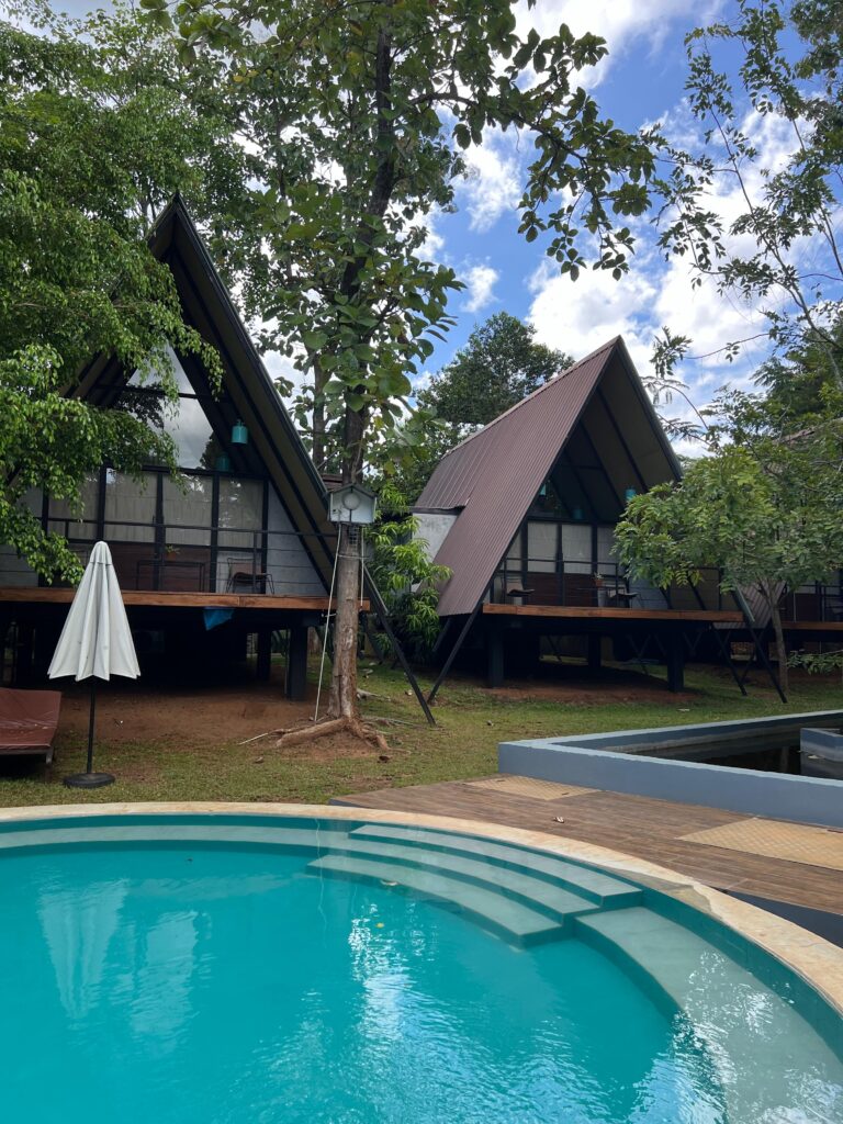 Unsere Unterkunft sah in echt noch viel schöner aus als auf den Bildern. Das Kottawatta River Bank Resort besteht aus zwölf zeltartigen Hütten mit einem großen Pool in der Mitte der Oase. Die modernen Spitzdach-Häuschen sind nach einem Indoor-Outdoor-Living Konzept gebaut, was einem das Gefühl gibt, in der Natur zu übernachten. Wir konnten jedes Blatt, was von den Bäumen auf das Dach gefallen ist und die ganzen Vögel und Tiere hören – wie beim Camping. Zudem gibt es ein echt gutes hoteleigenes Restaurant mit traditioneller Küche. Hier haben wir unsere erste Reisechallenge erfüllt: Wir haben insgesamt 50 Challenge-Karten, die wir selbst noch nicht kennen, sondern nach und nach zufällig ziehen. Immer erst dann, wenn wir die gezogene Karte erfüllt haben, dürfen wir mit der nächsten weitermachen. – vielen Dank nochmal für die tolle Idee an Kristins Marketing-Mädels 🙂