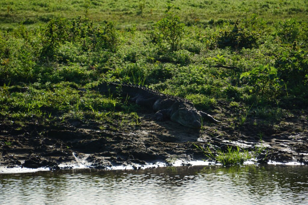 Beim Weiterfahren entpuppte sich die Lichtung als wunderschöne Seelandschaft mit vielen Krokodilen, Schakalen, Wasserbüffeln, bunten Vögeln und Echsen.