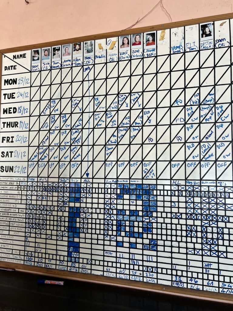 Nach meinem Orientierungstag hatte ich eine Woche Zeit einen Mentor auszuwählen, der mir für Fragen zur Verfügung stehen sollte und auch meine Aufgaben abzeichnen durfte. Ich entschied mich für Alex, der aus Wien kommt und auch zufälligerweise meinen Cousin Flo kennt. 😁 An der Bar von Crystal Dive hängt ein großes Board, an dem jeder Divemaster Kandidat mit Foto und den Punkten, die er noch zu erledigen hat, gelistet ist. Die Koordinatoren und Instructor tragen dort regelmäßig ein, was die nächsten Tage ansteht und für welche Kurse jeder Einzelne vorgesehen ist. Zudem konnte ich so gleich zu Beginn sehen, wer noch so im Programm ist, um alle besser kennenzulernen. Wie auf dem Board zu erkennen ist, ist die Liste ziemlich lang: