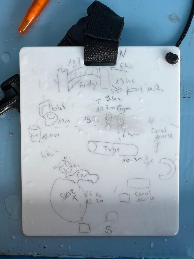 • ein Mapping Projekt (eine Tauchstelle Unterwasser skizzieren und durch das Zählen von Flossenschlägen und einem Kompass eine Karte erstellen)