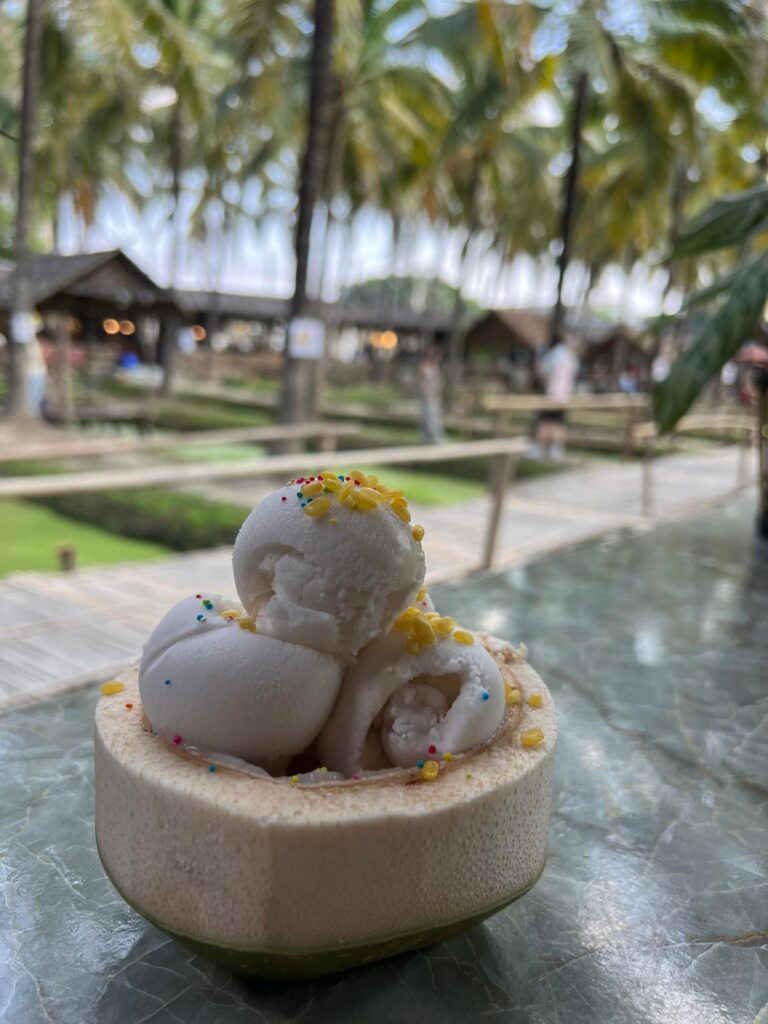 Auf dem Rückweg fuhren wir einen kleinen Umweg (wo wir trotz Google Maps noch mindestens zweimal falsch abbogen) zum sogenannten Coconut Market. Dort findet täglich auf einer Kokonusplantage ein kleiner Markt statt, wo viele Produkte zum Thema Kokosnuss angeboten werden. Wir entschieden uns für ein super leckeres frisches Kokosnusseis! 🥥🌴