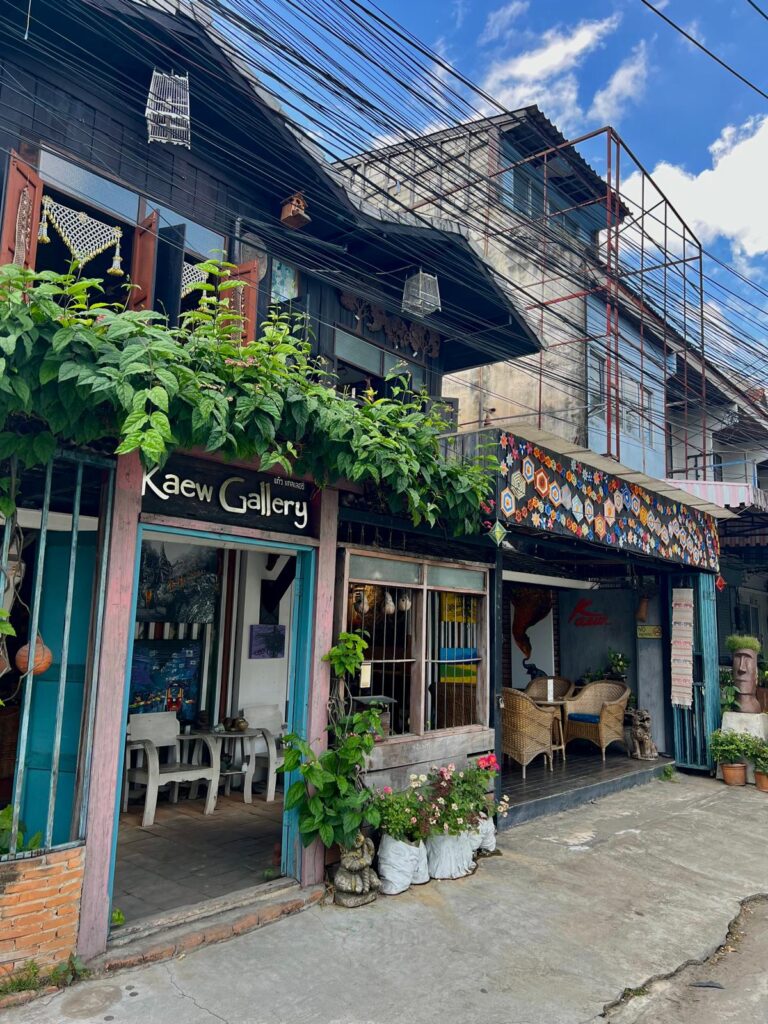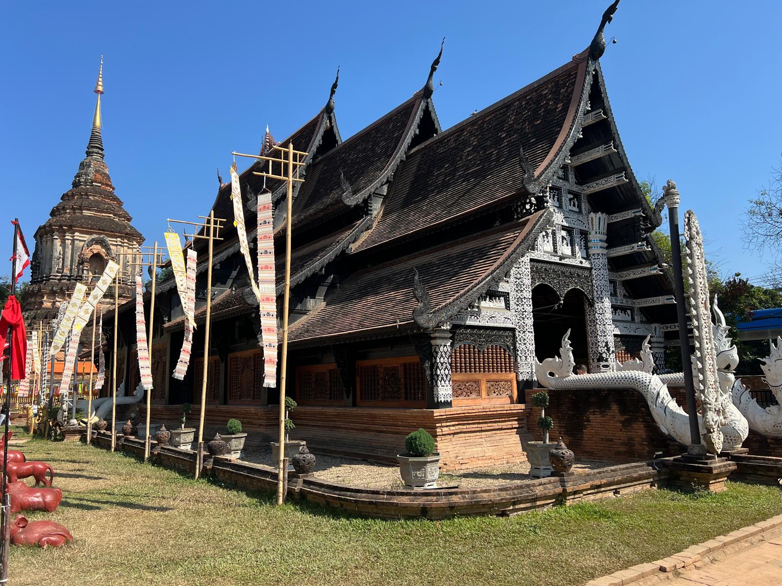 Am Abreisetag ging unser Bus bereits um 8 Uhr morgens. Um so lange wie möglich schlafen zu können zögerten wir das Aufstehen so weit wie möglich hinaus, was uns am Ende fast noch zum Verhängnis wurde. Ein Grab Taxi sollte uns vom Hotel zum 20 Minuten entfernten Busbahnhof bringen. Anders als sonst hatten wir tatsächlich Schwierigkeiten einen Fahrer zu finden und als uns endlich einer zusagte, hatte er ausgerechnet auch noch eine Anfahrtszeit von  15 Minuten. Schlussendlich kamen wir erst um halb 8 vom Hotel los. Durch den starken Verkehr mussten wir bis zur Ankunft zittern, doch unser Rennfahrer brachte uns 7 Minuten vor Abfahrt zum Ziel. Dann noch schnell die Tickets am Schalter gelöst und ab zum Bus gerannt. Noch einmal Glück gehabt. 😊 10 Stunden später und 750km weiter nördlich haben wir uns dann in der Abendsonne in Chiang Mai wiedergefunden. Unser Hotel 99 The Gallery für die nächsten sieben Nächte liegt im sogenannten Altstadt-Quadrat der Stadt. Das Zimmer war zum Innenhof gerichtet und sehr sauber. Die Lage war jedenfalls ein super Ausgangspunkt, um die gesamte Stadt fußläufig erkunden zu können. Die ersten zwei Tage verbrachten wir damit durch die Straßen zu schlendern, kleine Lädchen, schöne Holztempel und Cafés zu entdecken und den Tag im Stadtpark ausklingen zu lassen. Eins stand schnell fest: Wir LIEBEN Chiang Mai! 🥰