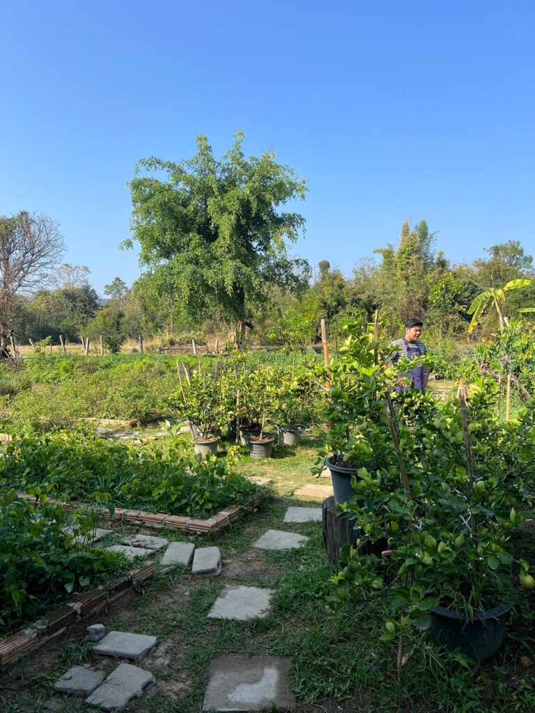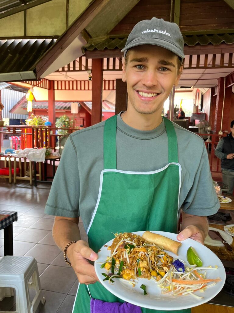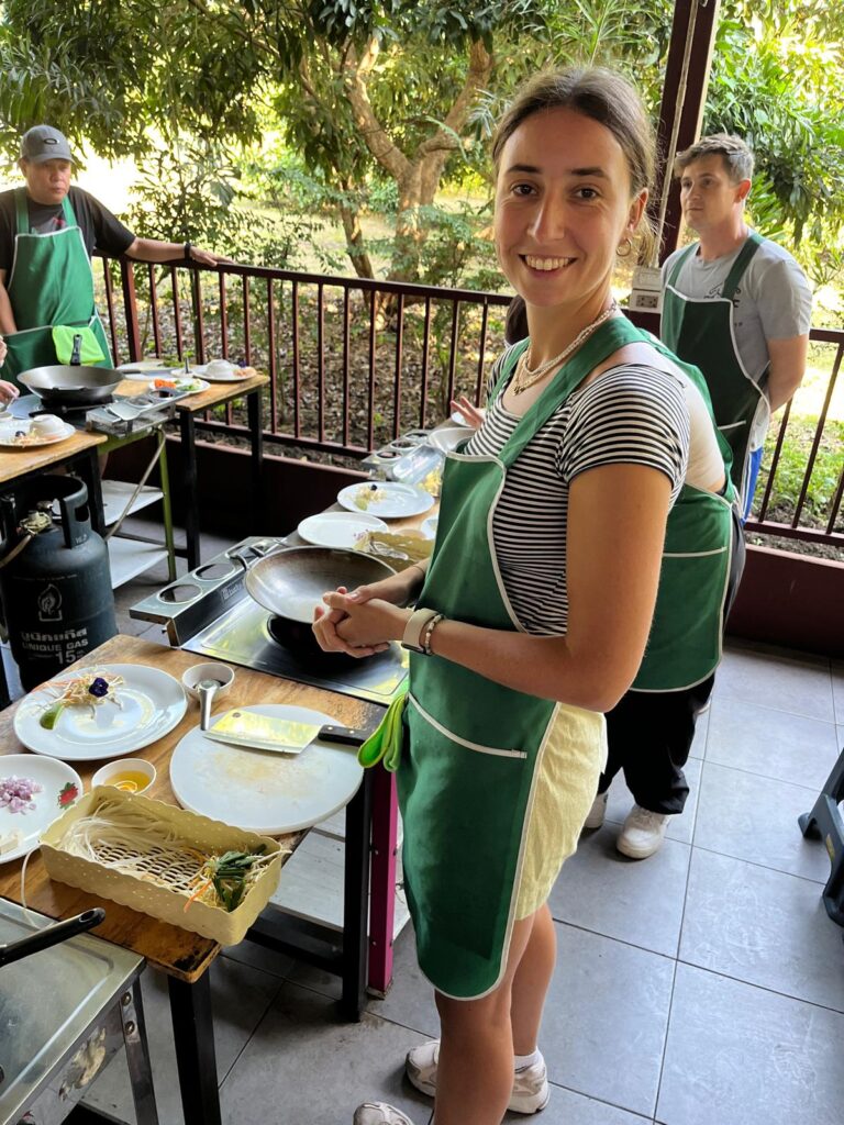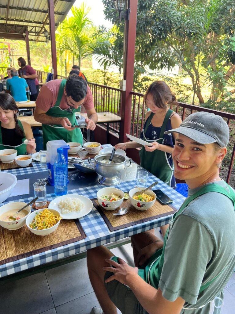 Am Montag stand für uns ein Kochkurs auf der Smile Organic Farm auf dem Plan. Hierfür wurden wir bereits um 8:15 Uhr von unserem Kursleiter Chef Love abgeholt. Zuerst ging es auf einen lokalen Markt, auf dem er uns erste Kochzutaten zeigte. Anschließend fuhren wir 45 Minuten zur Farm. Wir konnten uns je ein Stir-Fried Gericht, Curry und eine Suppe aussuchen, die wir an dem Tag kochen wollten. Alle Gerichte waren als vegetarische Option mit Tofu möglich und so entschieden wir uns gemeinsam für Pad Thai, ein Khao Soi Curry und die Coconut Milk Soup. Im Verlauf der nächsten vier Stunden ernteten wir frische Kräuter aus dem Farmgarten, mörserten unsere eigenen Currypasten und kochten die gewählten Gerichte an individuellen Wok-Stationen. Nach jedem Gang gab es ein gemeinsames Essen. Mit vollen Bäuchen und einem digitalen Kochbuch im Gepäck wurden wir anschließend zurück in die Stadt gefahren. Es hat uns super viel Spaß gemacht und so lecker geschmeckt, sodass wir alle Gerichte auch definitiv nach unserer Reise kochen wollen. 🌶️🍜🫛🥢