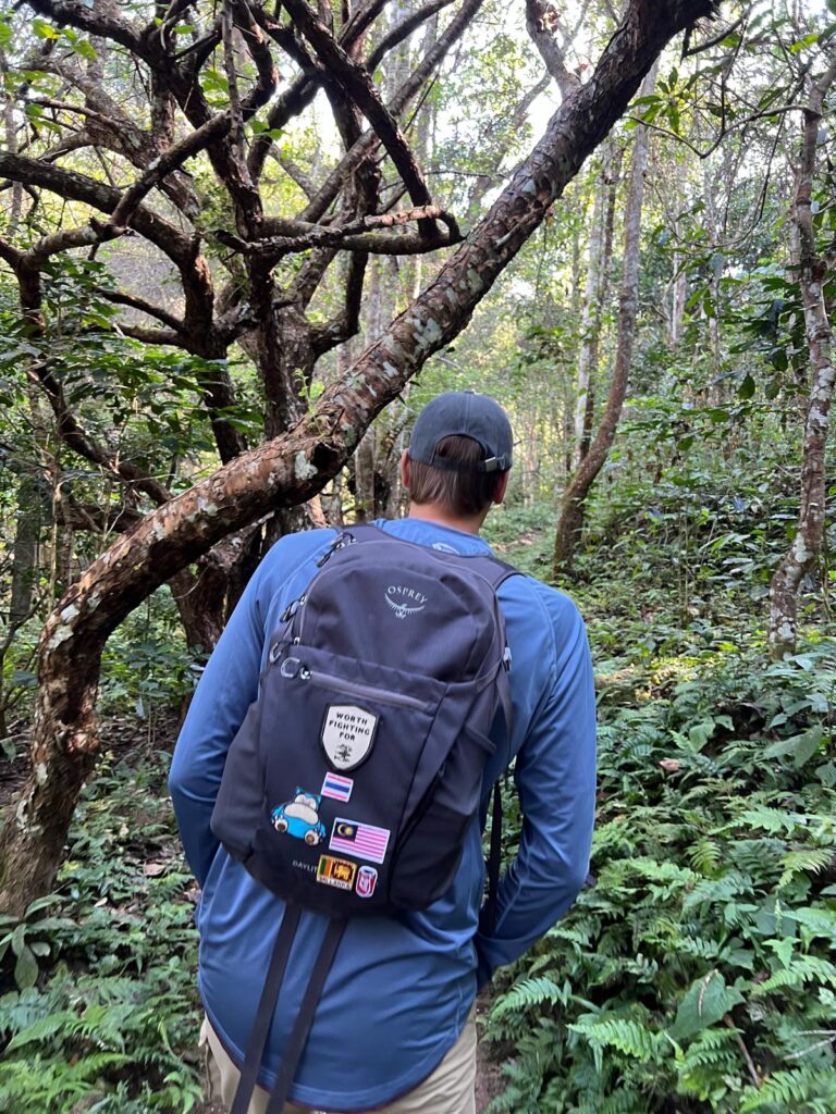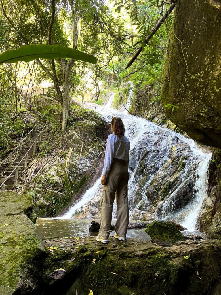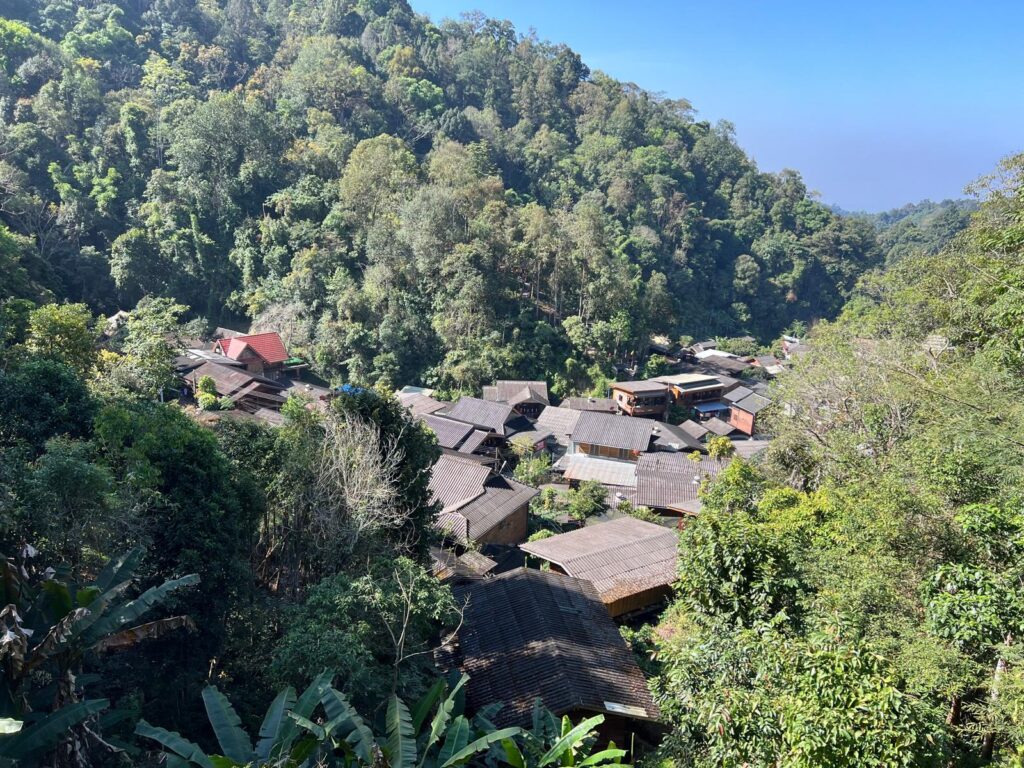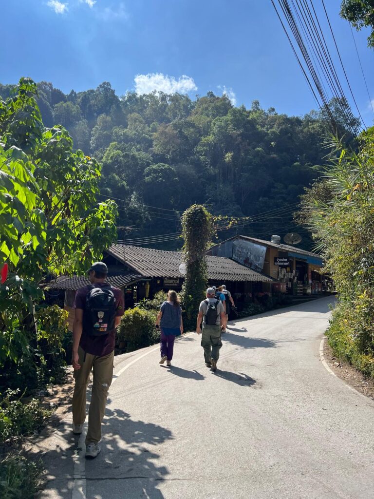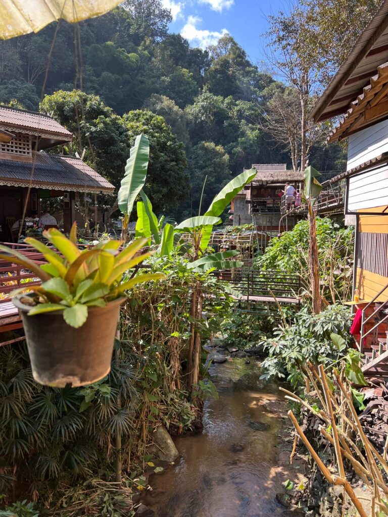 Unsere Gruppe bestand neben uns beiden und unserer goldigen Reiseführerin TK aus zwei weiteren Pärchen aus Österreich und der Schweiz und einem Amerikaner. Die Wanderung zu den Gibbon Affen findet häufig bereits zu Beginn der Tour statt, da sie sich meist morgens in der Nähe des Dorfes aufhalten. Leider teilte uns TK noch während der Fahrt ins Dorf mit, dass sie am Morgen noch nicht gesichtet wurden und wir unser Glück am Nachmittag versuchen würden. Bei der lokalen Waldwanderung begleitete uns zusätzlich noch Mr. Boon, ein älterer Herr aus dem Dorf, der uns viele unterschiedliche Pflanzen zeigte und uns aus verschiedenen Blättern Tiere flochtete. Bei einem Zwischenstopp in einem Café auf dem Berg mit Blick über das Dorf entschieden wir uns für einen Americano Kokosnuss und einen Americano Passionsfrucht. Diese Kombination aus Kaffee und frischem Fruchtsaft ist typisch für den thailändischen Norden und schmeckt überraschend gut, obwohl die Kaffeeröstung aus dem Dorf sehr intensiv und etwas zu bitter ist. Nach der kurzen Erholung ging es auf dem Weg hinunter zum Dorf durch den Wald an einem Wasserfall entlang, wo wir für ein paar Bilder einen Stopp einlegten. Unten angekommen kehrten wir in einem Restaurant mit lokalen Spezialitäten ein. Wir entschieden uns für ein Panang-Curry und einem Gemüsegericht aus der Region. Als uns TK während des Essens erneut mitteilte, dass die Affen noch nicht gesichtet wurden und wir dennoch gleich auf gut Glück zum Beobachtungspunkt aufbrechen würden, war die Stimmung der Gruppe etwas getrübt.