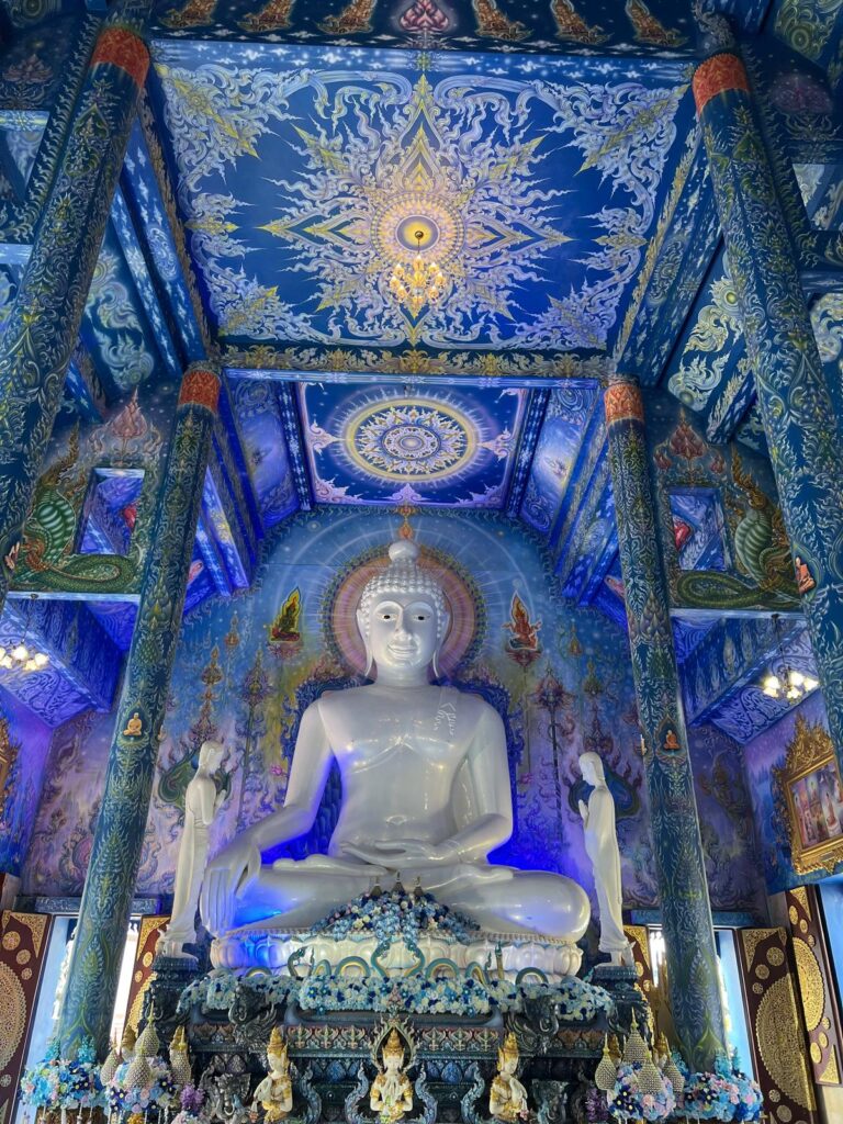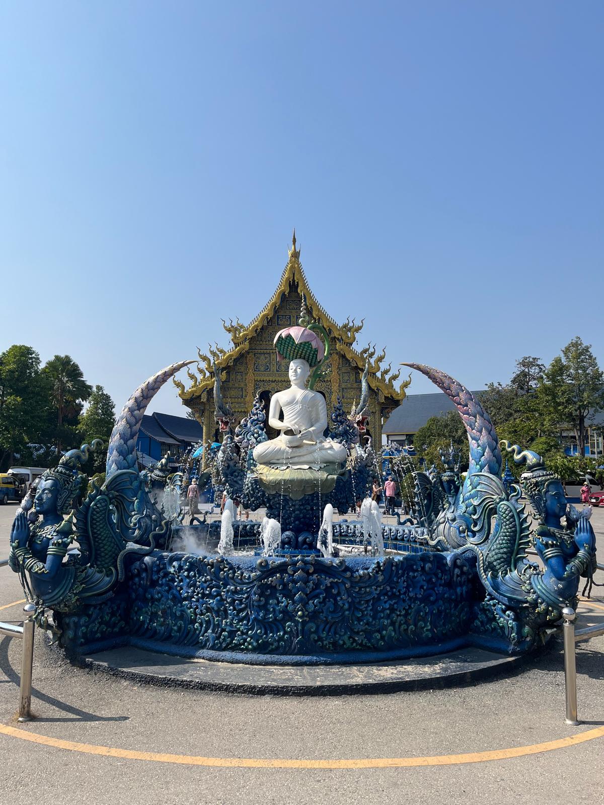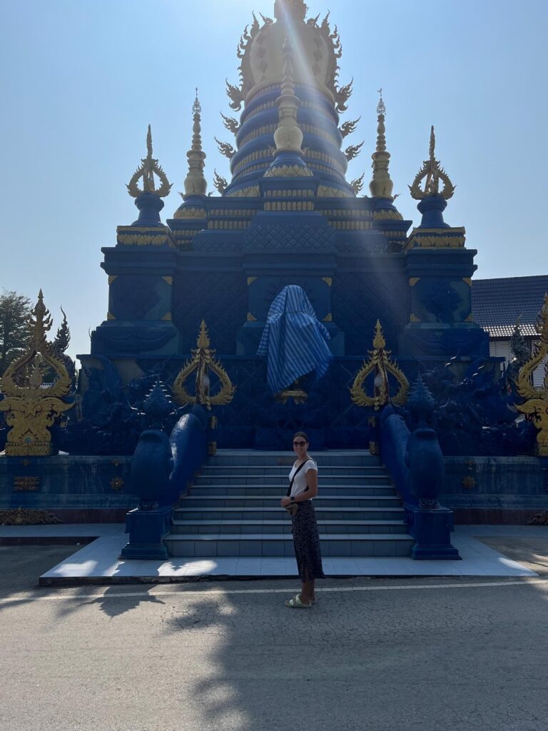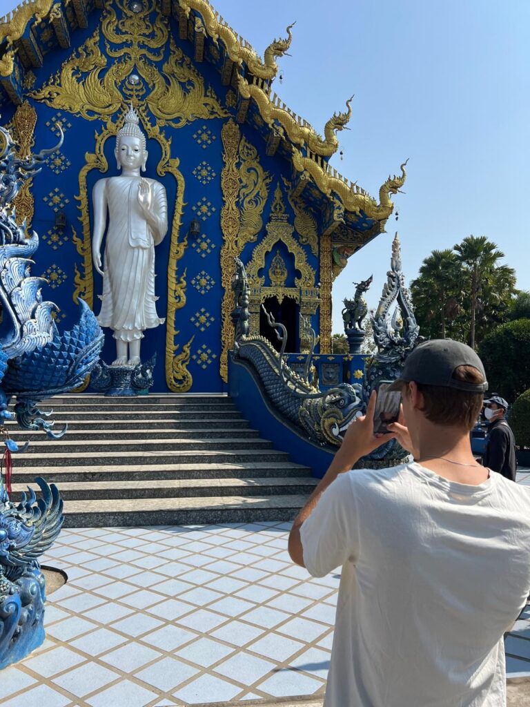 Am Abend gingen wir dann noch zum Chiang Rai Night Bazar. Auch hier gab es wieder Stände mit Kleidung, Souvenirs und Essen, sodass wir nochmal in den Genuss der thailändischen Spezialitäten kamen. Zurück im Guesthouse planten wir für den nächsten Tag eine kleine Tour zu den eher außerhalb gelegenen Attraktionen. Erst wollten wir uns einen Roller mieten, beschlossen dann aber doch zu Fuß zu gehen. Nach dem Frühstück machten wir uns auf den Weg zur anderen Flussseite und entdecken von der Brücke aus ein süßes Café direkt am Ufer. Dort wollten wir auf jeden Fall auf dem Rückweg einen Stopp einlegen. Das erste Ziel war jedoch der Blaue Tempel. Der Name Wat Rong Seur Ten hat erstmal gar nichts mit Farben zu tun, sondern heißt übersetzt soviel wie „Tempel des tanzenden Tigers“. Vor rund 100 Jahren wurde an gleicher Stelle ein Tempel erbaut, aber dieser verfiel im Laufe der Zeit. Dazu gab es die Gerüchte, das sich in der Gegend viele wilde Tiger herumtrieben, die sich dort sammelten, um den Fluss Mae-Nam-Kok zu überqueren. Auf dem heiligen Boden wurde dann 2016 der blaue Tempel errichtet, der durch seine außergewöhnliche Farbe Freude bringen soll.