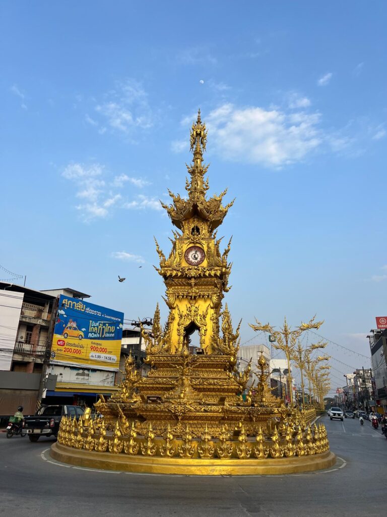 Abends beschlossen wir unsere letzten Thai-Baht für einen saftigen vegetarischen Burger auszugeben und noch einmal Mango Sticky Rice auf dem Night Bazar zu essen. Beim Rückweg zu unserer Unterkunft machten wir noch Halt bei dem goldenen Glockenturm, der ab 19 Uhr zu jeder vollen Stunde mit passender Musik leuchtet.