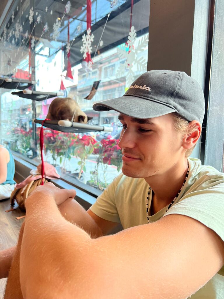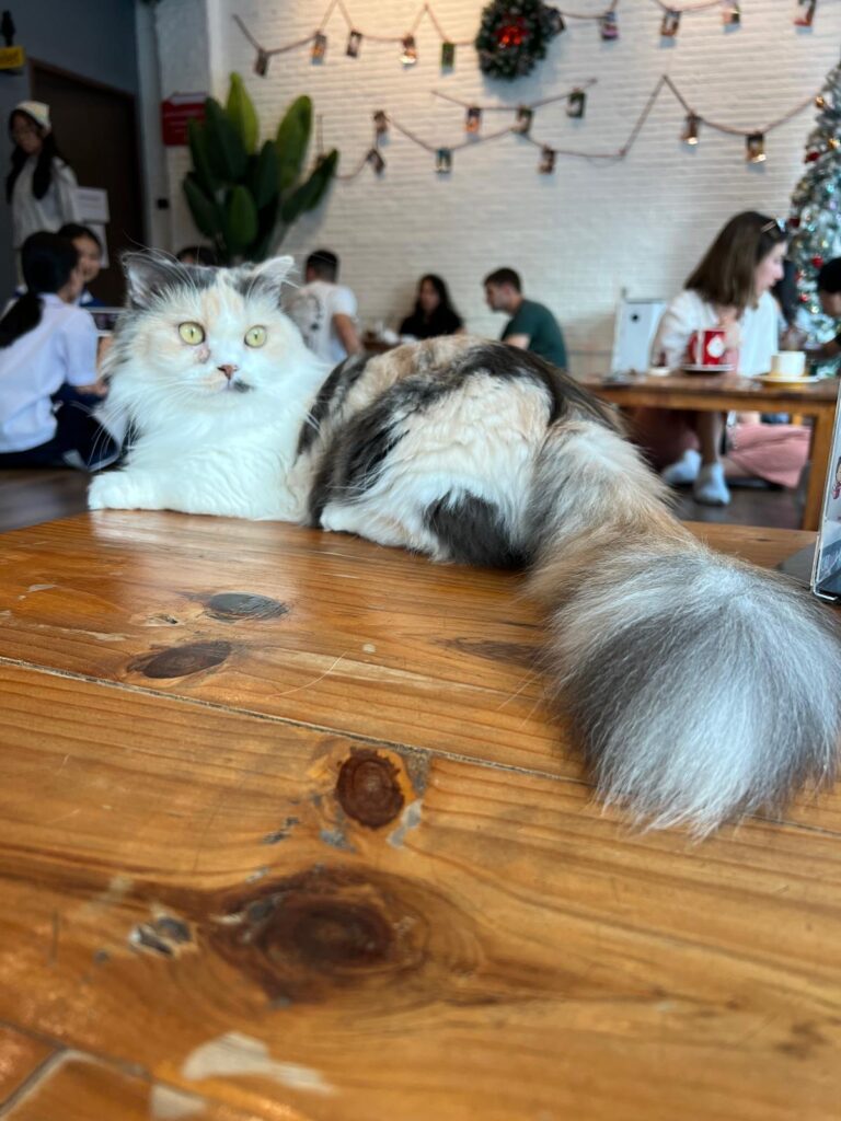 Zudem machten wir einen Halt beim Cat ’n Cup Katzencafé. Hier konnten wir die zugehörigen Katzen beobachten, mit ihnen spielen und sie streicheln. Es schien allerdings als hätten sie bereits genügend Streicheleinheiten und Aufmerksamkeit bekommen, denn sie waren leider nur an ihrem Futter interessiert. Eine flauschige Katze mit viel zu kurzen Beinen gesellte sich dennoch auf unseren Tisch und ließ sich auch mal graulen. 😄🐈