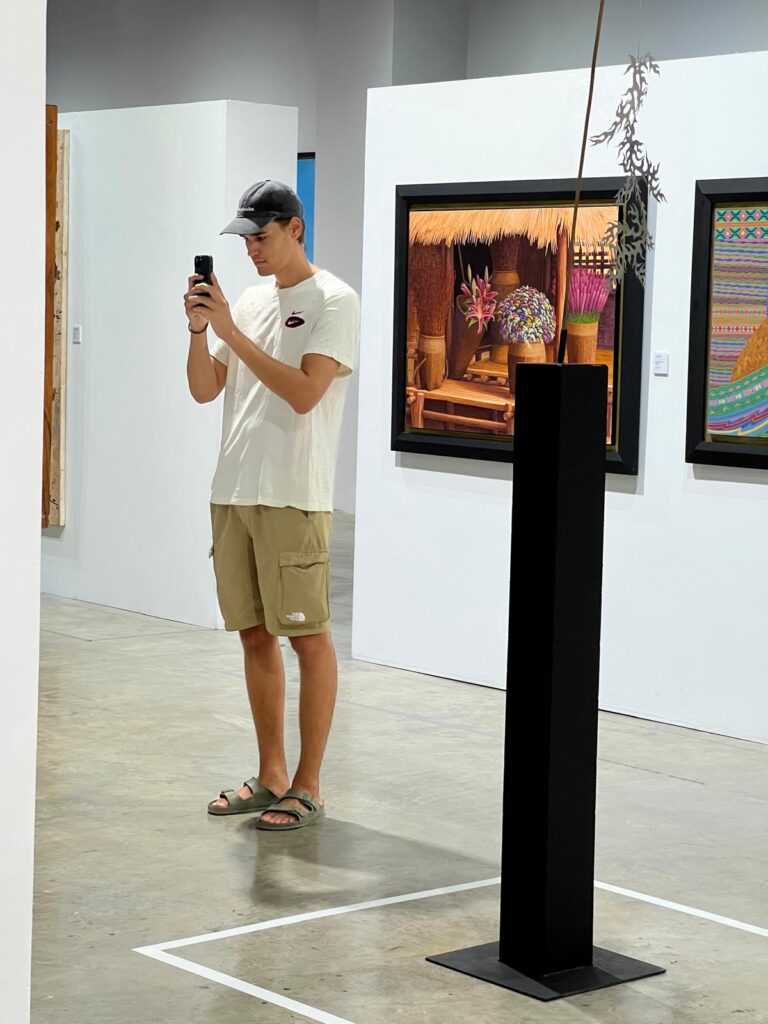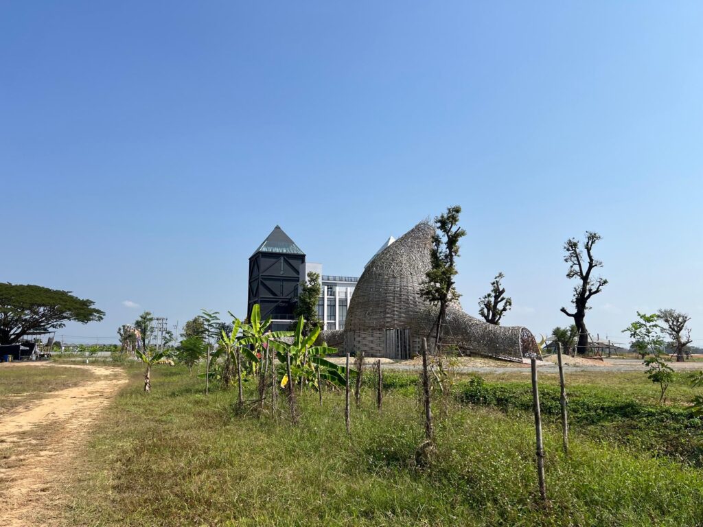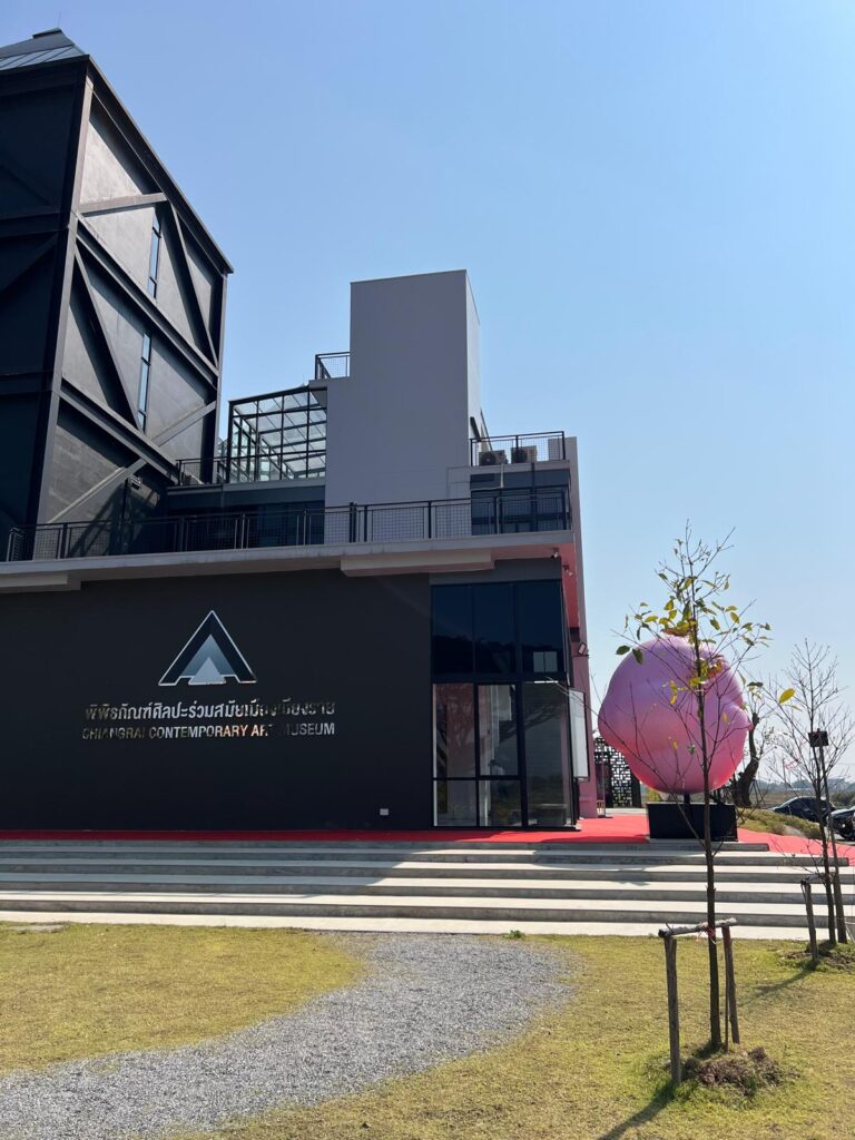 Weiter ging es dann entlang einer Autobahn mit spontanem Stopp bei einem Café-Truck. Dort gönnten wir uns einen eiskalten Thai-Green-Tea für den 45 minütigen Weg zum Museum. Google Maps leitete uns schließlich von der vierspurigen Autobahn, durch Felder bis hin zu bewachsenen Wegen und wir hofften, auf den letzten Metern nicht umkehren zu müssen. Doch plötzlich konnten wir das Chiangrai International Contemporary Art Museum hinter den Baumkronen erspähen. Die Ausstellung war kostenlos und in einem hochmodernen Gebäude. Scheinbar wurde es erst 2023 eröffnet.