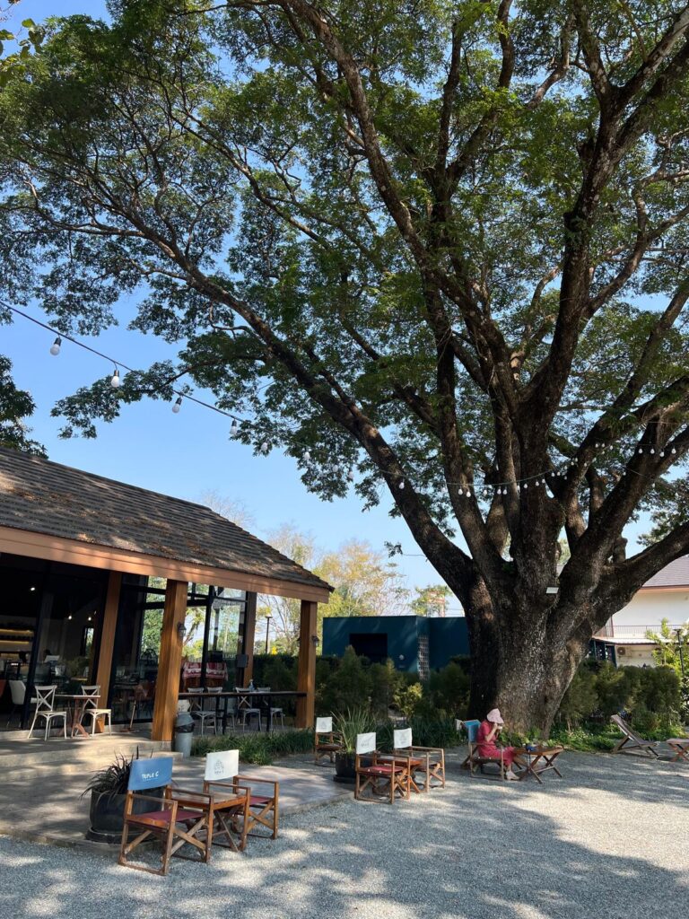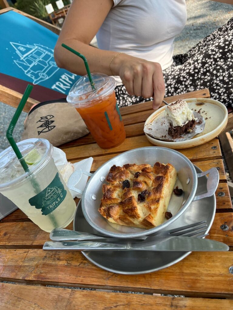 Für den Rückweg bestellten wir uns dann ein Grab Taxi, was uns für gerade mal 2,50€ zu dem Café am Flussufer brachte und uns eine Stunde Fußmarsch ersparte. Wir stellten fest, dass das schöne Gelände zu dem Triple C Campingplatz gehört. Unter einem riesig großen Baum chillten wir ein paar Stündchen in Liegestühlen und fingen an unseren Chiang Mai Blog zu schreiben. Der eine Kuchen mit Schokolade und Bananen (der auf dem Foto schon fast leergegessen ist) war sooooo yummy und erinnerte uns an Ankes Milkatorte! 😍