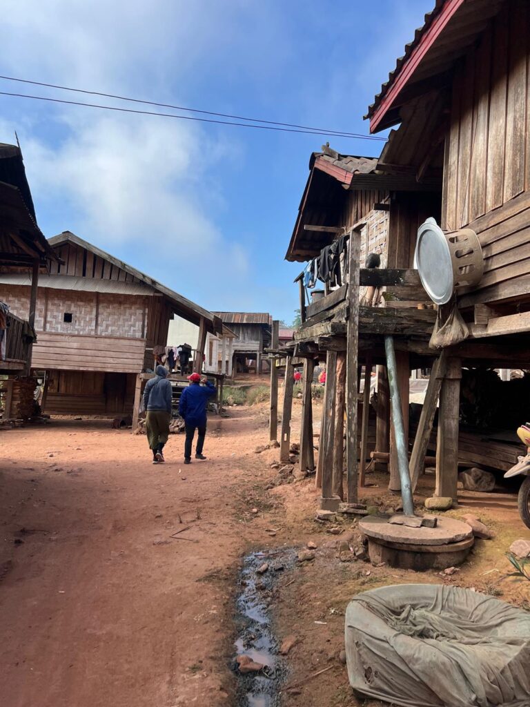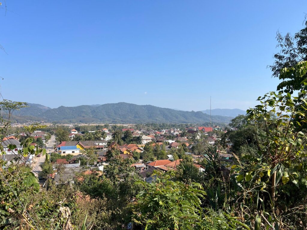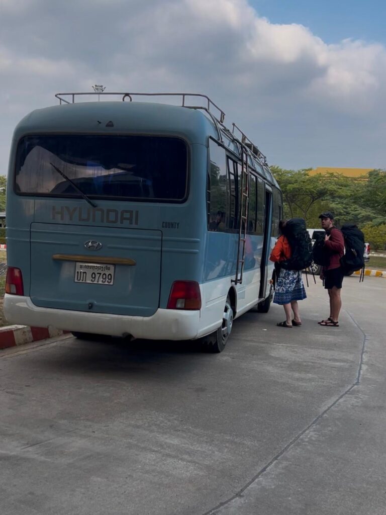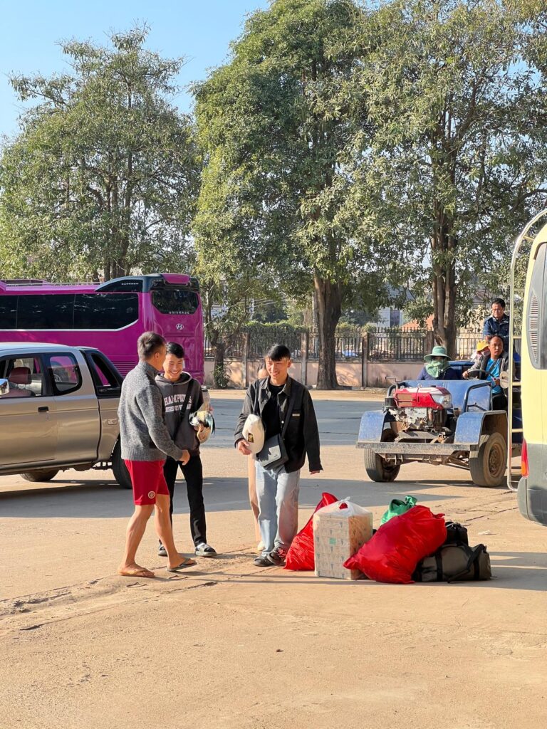 Am nächsten Morgen ging es bei 9 Grad, gezwiebelt in all unseren langen Klamotten, um 7 Uhr zum überraschend leckeren Frühstück und eine Stunde später zum Busbahnhof. Dort wartete glücklicherweise bereits unser Minivan, woraufhin wir unser Gepäck einluden. Circa eine Viertelstunde vor Abfahrt versuchte uns ein Mann mit Händen und Füßen zu erklären, dass alle ihre Rucksäcke wieder ausladen sollen. Verwundert leisteten wir Folge und der Minivan fuhr daraufhin einfach davon. Da sich bereits einige Leute angesammelt hatten, vermuteten (und vor allem hofften) wir, dass auf einen Kleinbus umstiegen wird. Doch zu unserer Enttäuschung fuhr um Punkt 9 ein baugleicher Minivan vor. Wir sicherten uns direkt einen Sitzplatz nebeneinander auf einem Doppelsitz. Als wir aus dem Fenster schauten, sahen wir plötzlich einen Mann mit einem lebendigen Huhn auf dem Arm und machten drei Kreuze, als er zum Glück in den Bus nebenan einstieg. Verwirrt darüber, wie alle Leute in diesem Auto Platz finden sollen, wurden zeitgleich zwei Pappkisten angekarrt und in den engen Gang zwischen die Sitzreihen gestellt. Unter die Sitze vor uns wurden zudem noch Reissäcke eingeladen. Das wars also komplett mit Lukas Beinfreiheit. 😂 Neben ihm auf der Pappkiste nahm ein laotisches Mädchen im rosa Ganzkörperplüschpyjama platz, die komplett nass an ihrem Ärmel war. Angeekelt und eingepfercht hieß es dann für die nächsten 3,5 Stunden Augen zu und durch. Die Strecke ähnelte den Serpentinen in den Alpen, nur mit super vielen Schlaglöchern.