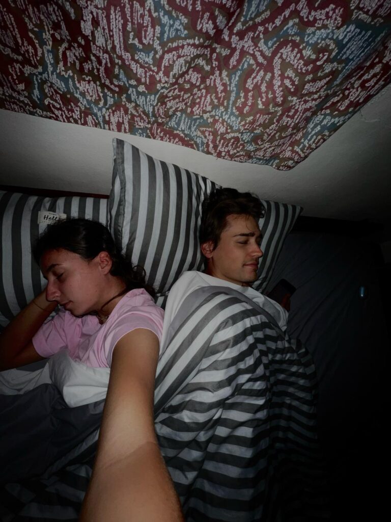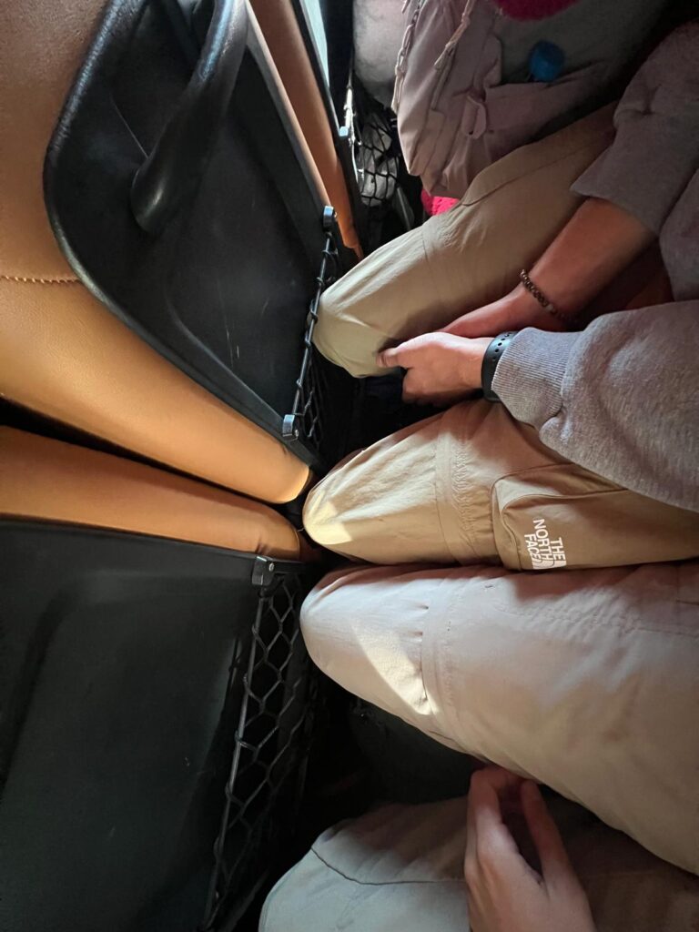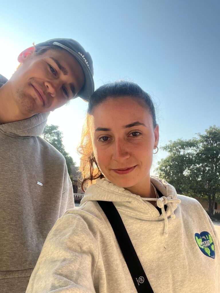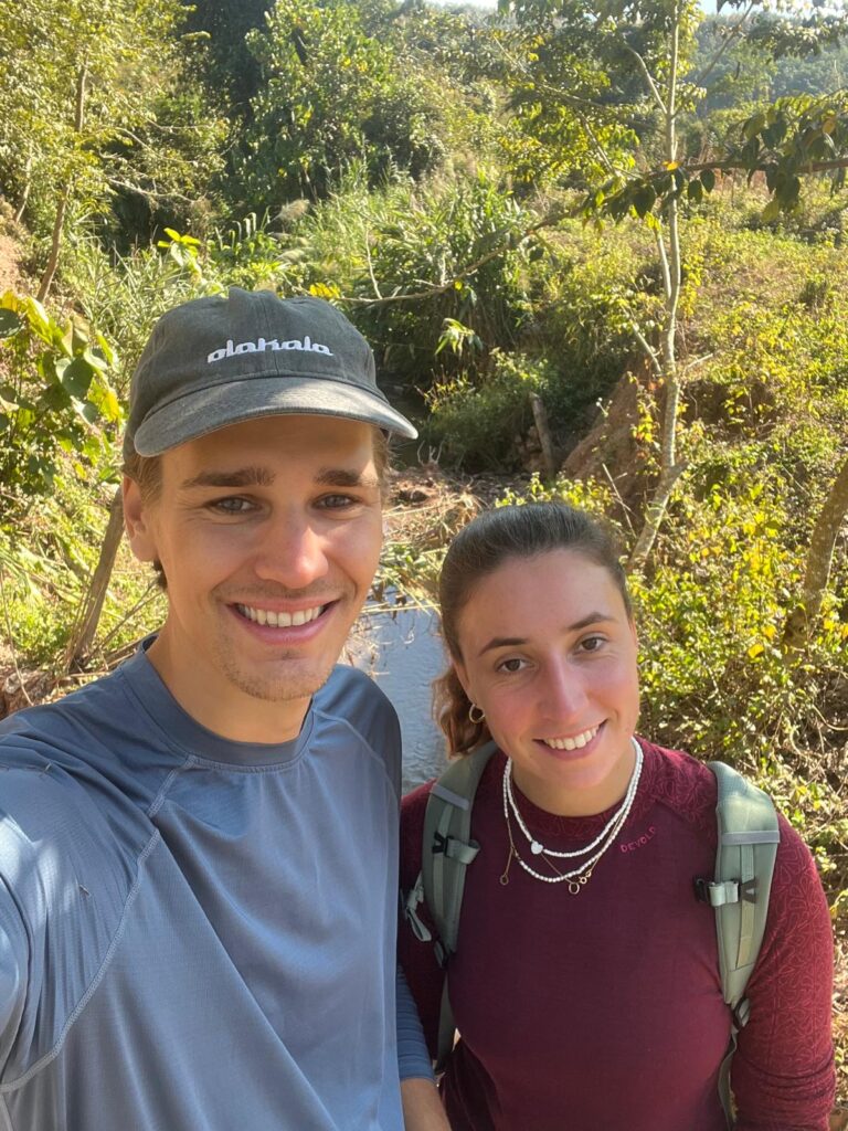 Am nächsten Morgen ging es bei 9 Grad, gezwiebelt in all unseren langen Klamotten, um 7 Uhr zum überraschend leckeren Frühstück und eine Stunde später zum Busbahnhof. Dort wartete glücklicherweise bereits unser Minivan, woraufhin wir unser Gepäck einluden. Circa eine Viertelstunde vor Abfahrt versuchte uns ein Mann mit Händen und Füßen zu erklären, dass alle ihre Rucksäcke wieder ausladen sollen. Verwundert leisteten wir Folge und der Minivan fuhr daraufhin einfach davon. Da sich bereits einige Leute angesammelt hatten, vermuteten (und vor allem hofften) wir, dass auf einen Kleinbus umstiegen wird. Doch zu unserer Enttäuschung fuhr um Punkt 9 ein baugleicher Minivan vor. Wir sicherten uns direkt einen Sitzplatz nebeneinander auf einem Doppelsitz. Als wir aus dem Fenster schauten, sahen wir plötzlich einen Mann mit einem lebendigen Huhn auf dem Arm und machten drei Kreuze, als er zum Glück in den Bus nebenan einstieg. Verwirrt darüber, wie alle Leute in diesem Auto Platz finden sollen, wurden zeitgleich zwei Pappkisten angekarrt und in den engen Gang zwischen die Sitzreihen gestellt. Unter die Sitze vor uns wurden zudem noch Reissäcke eingeladen. Das wars also komplett mit Lukas Beinfreiheit. 😂 Neben ihm auf der Pappkiste nahm ein laotisches Mädchen im rosa Ganzkörperplüschpyjama platz, die komplett nass an ihrem Ärmel war. Angeekelt und eingepfercht hieß es dann für die nächsten 3,5 Stunden Augen zu und durch. Die Strecke ähnelte den Serpentinen in den Alpen, nur mit super vielen Schlaglöchern.