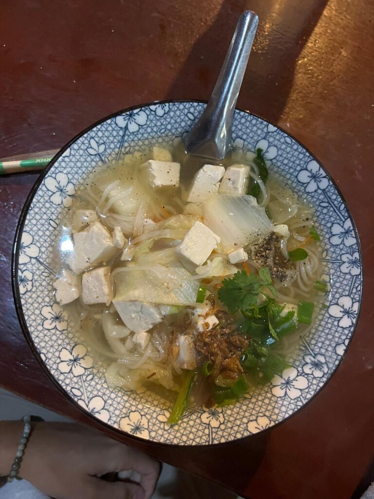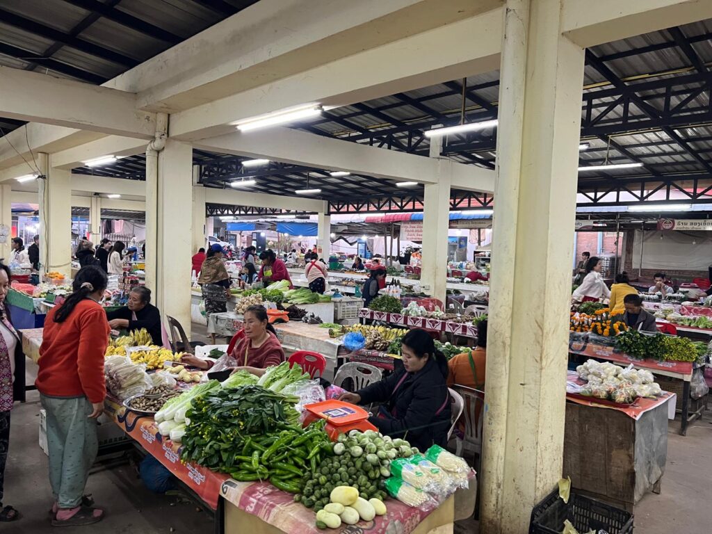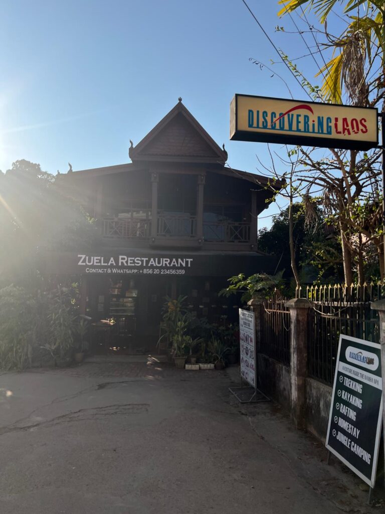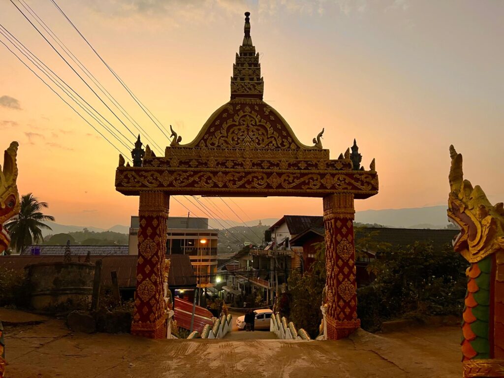 Zur Mittagszeit kamen wir dann endlich in Luang Namtha in der Nähe des Nam Ha Nationalparks an. Nach dem Check In in das Zuela Guesthouse erkundeten wir zu Fuß die Umgebung. Wir besuchten den Samakixay Tempel auf einem nahegelegenen Hügel, der leider zurzeit renoviert wird. Dennoch war die Aussicht über das Dorf ganz nett. Den restlichen Nachmittag verbrachten wir in einem kleinen Café und mit dem Buchen eines Trekking Ausfluges für den nächsten Tag. Zum Abendessen hatten wir uns den Night Market direkt gegenüber von unserer Unterkunft ausgesucht. Dieser war jedoch eine große Enttäuschung und auch etwas eklig. Ein Pärchen aus unserer Unterkunft, mit denen wir am nächsten Tag gemeinsam den Trekking Ausflug unternahmen, zeigte uns sogar ein Bild von gegrillten Ratten, die man dort kaufen konnte. 🤢 Glücklicherweise gab es direkt in unserer Unterkunft eine leckere vegetarische Nudelsuppe für kleines Geld. Das war ohnehin zum Aufwärmen genau das Richtige, denn nach Sonnenuntergang wurde es direkt richtig kalt.