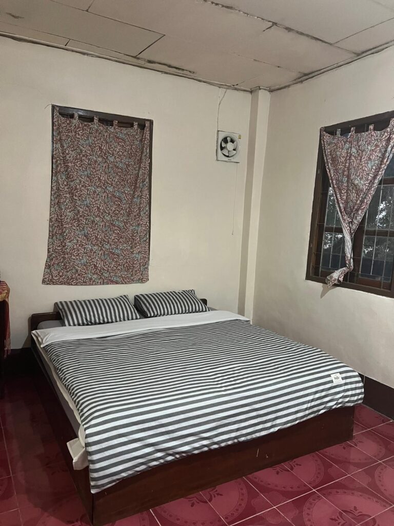 Dort angekommen checkten wir direkt in unser Gasthaus Somewhere over the river ein und machten uns noch vor Einbruch der Dunkelheit auf den Weg, Geld abzuheben und eine Sim-Karte zu kaufen. Aufgrund der Warterei hatten wir leider keine Zeit mehr, das Dörfchen richtig zu erkunden. Die letzten Sonnestrahlen beobachteten wir von einem kleinen Tempel aus und gingen anschließend zum Abendessen. Zurück in der Unterkunft nahmen wir zum ersten Mal die dort herrschende Kälte wahr. Bei 10,50€ pro Nacht inklusive Frühstück konnten wir allerdings auch keine Heizung oder Isolierung des Zimmers erwarten. Also kuschelten wir uns unter die immerhin dicke Decke und versuchten früh zu schlafen.
