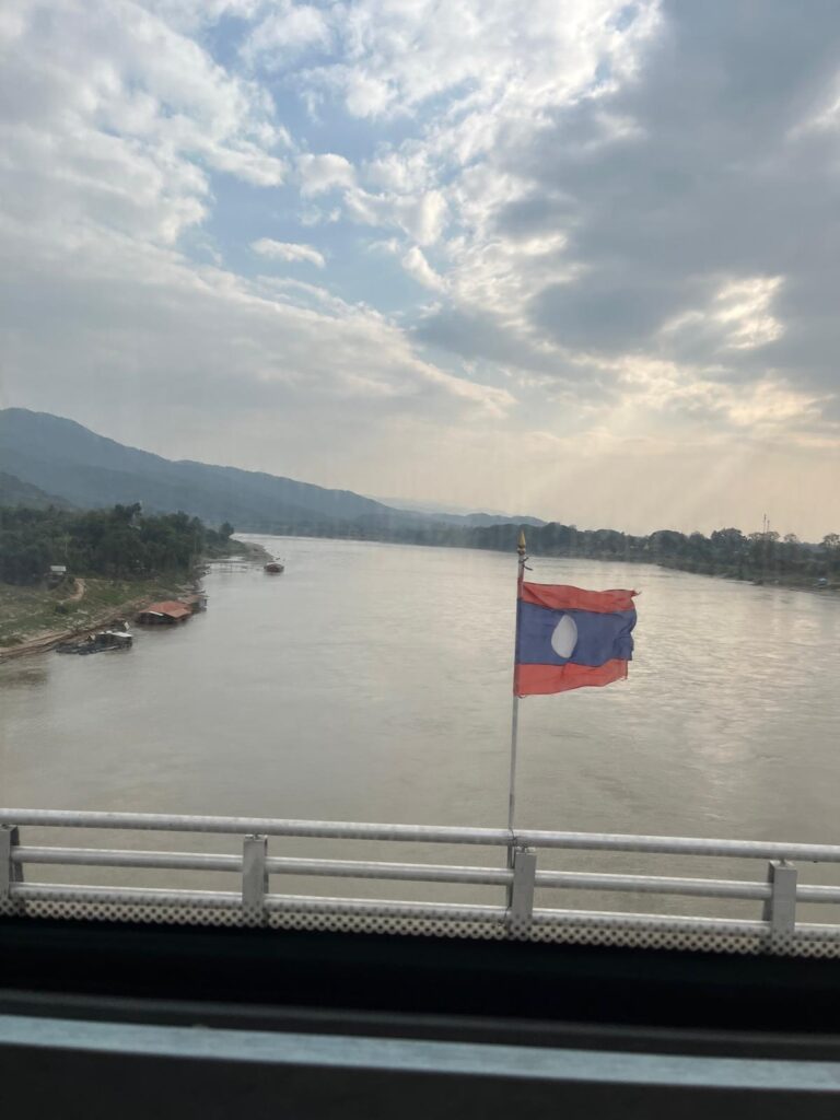 Der Reisetag nach Laos begann vielversprechend entspannt mit unserer pünktlichen Abholung um 13 Uhr in Chiang Rai. Keine 1,5 Stunden später wurden wir mit noch zwei weiteren Pärchen am thailändischen Grenzposten vor der Thai-Lao-Friendshipbridge 4 rausgeschmissen. Unwissend was als nächstes passiert und wo wir hinmüssen, machte uns unser Fahrer mit wilden Gestiken deutlich, dass er noch ein Gruppenfoto schießen will und zeigte anschließend auf die Grenzhäuschen. Also reihten wir sechs uns verwirrt nebeneinander auf und lächelten verlegen in die Kamera. Nachdem er das Bild geknipst hatte stieg er jedoch einfach ein und fuhr davon. Wir begaben uns dann mal Richtung der menschenleeren Grenze auf das einzig besetzte Häuschen zu, woraufhin unser thailändisches Visum auf Gültigkeit kontrolliert wurde und wir den entsprechenden Ausreisestempel erhielten. Nun offiziell ausgereist wollte uns eine Frau an einem weiteren Schalter ein Busticket verkaufen. Wir verstanden, dass uns ein weiterer Bus über die Brücke zur laotischen Grenze bringen sollte und wir hierfür aber bereits gezahlt hatten. Ohne Probleme händigte sie uns daraufhin unsere Bustickets aus. Noch etwas früher als geplant ging es dann um 15:45 Uhr auf die andere Seite des Mekongs. Gerade einmal fünf Minuten später begann an der Grenze von Laos das Chaos. Wir hatten bereits vorab unser Visum online erworben, um uns bei der Einreise Zeit und Stress zu ersparen -dachten wir zumindest. 😅 Auf dem Weg zum Grenzposten kam plötzlich ein kleiner Mann angerannt und zeigte uns unser Gruppenfoto auf seinem Handy. Er teilte uns mit, dass er unser Fahrer für den restlichen Weg sei und wollte uns zum Visa on arrival (bei Ankunft) leiten. Wir erklärten ihm, dass wir bereits ein eVisum haben, woraufhin er nur nickte und uns den dafür vorgesehenen Schalter zeigte. Dann dampfte er wieder ab. Dort angekommen stellten wir verwundert fest, dass der Schalter nicht besetzt war. Uns blieb also nichts anderes übrig, als uns an dem einzig anderen Schalter hinter den anderen Leuten einzureihen. Endlich vorne angekommen reichte Kristin dem Polizisten ihren Reisepass. Er blätterte mehrmals verwirrt durch den ganzen Pass, woraufhin wir ihm mitteilten, dass wir ein eVisum beantragt haben. Unfreundlich und genervt zeigte er auf das leere Häuschen nebenan und machte uns nonverbal deutlich, dass wir uns dort anstellen müssen. Etwas verdattert gingen wir rüber und warteten ab. Kristins Pass lag noch bei ihm im Häuschen, wir standen da wie bestellt und nicht abgeholt und er kontrollierte einfach die nachfolgenden Leute weiter. Nachdem der letzte aus der Schlange bedient war, stand der Grenzpolizist auf und wechselte in das eVisa Häuschen. Völlig ungläubig schauten wir beide uns an, während er nun endlich den Einreisestempel auf die Seite knallte. Danach war noch Lukas Pass dran und dann konnten auch wir die Grenze passierten. -aber nicht bevor er uns noch ohne Erklärung 100 Baht abknöpfte. Auf der anderen Seite sahen wir ein weiteres Kassenhäuschen, an dem die anderen Reisenden ihr Visa on arrival bezahlten. Da wir mit unserem eVisum offensichtlich nicht betroffen waren, gingen wir einfach an der Schlange vorbei und hielten Ausschau nach dem blauen Bus, so wie es uns unser Fahrer vorab erklärte. Kaum draußen, eilte uns eine Frau nach und teilte uns allen Ernstes mit, dass wir uns doch anzustellen haben, um eine Touristenabgabe von 20 Baht (circa 60 Cent) zu zahlen. Etwas angefressen stellten wir uns hinten an. Das ohnehin teurere eVisa hat uns also weder Zeit noch Stress erspart -wir waren sogar mit die Letzten. 🫠