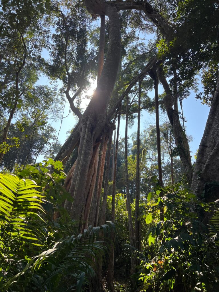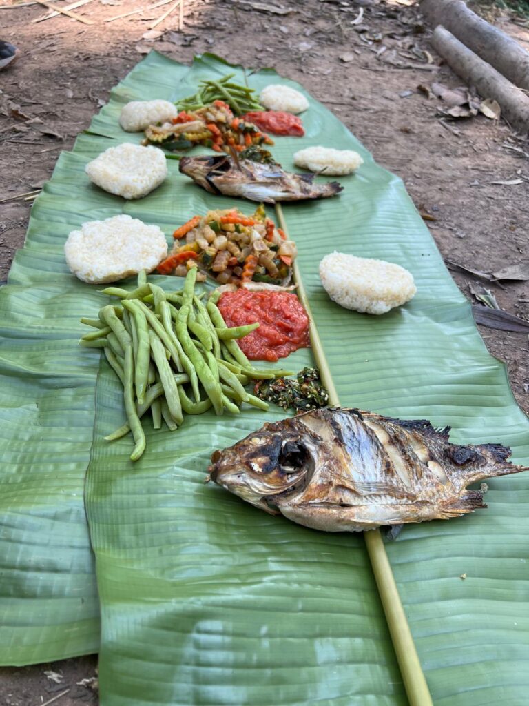 Unsere Trekking Tour ging circa 10km hoch und runter durch den dichten Wald. Leider müssen wir sagen, dass es weder Tiere zu beobachten noch schöne Aussichtspunkte auf dem Weg gab, wodurch es nach einer Zeit etwas langweilig wurde. Ein Highlight war jedoch das gemeinsame Mittagessen mitten im Wald auf großen Bananenblättern. Es gab Klebreis, gebratenes Gemüse, frische gekochte Bohnen, eine sehr leckere Koriander-Chili-Paste, eine süßliche Tomatensoße und für die anderen frisch gegrillten Fisch. Anfangs waren wir sehr skeptisch, doch es war überraschend lecker und stärkte uns für die restliche Tour. Den letzten Kilometer ging es bergab durch eine riesige Kautschukbaum-Plantage bis zurück zur Straße. Dort wurden wir nach ein paar Minuten von unserem Tuk Tuk Fahrer eingesammelt. Auf dem Rückweg machten wir erneut Halt in einem anderen der kleiner Dörfchen. In Nam Lue Village zeigte Lik uns sogar noch eine laotische Grundschule, die zurzeit Ferien hatte. Den Nachmittag und Abend verbrachten wir erneut im Café und Restaurant unserer Unterkunft.