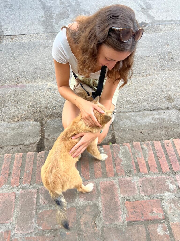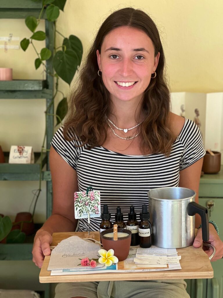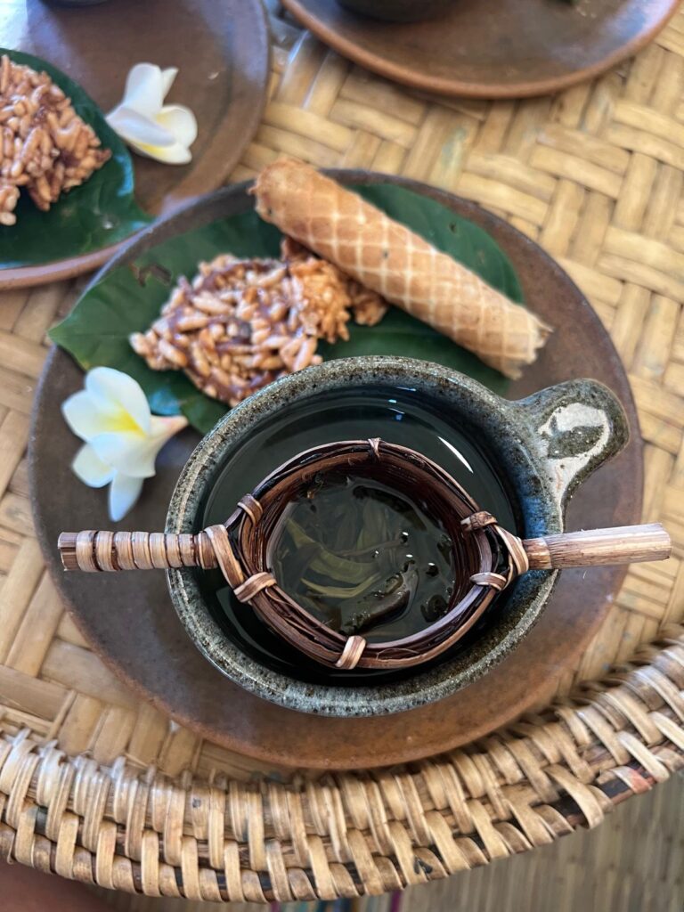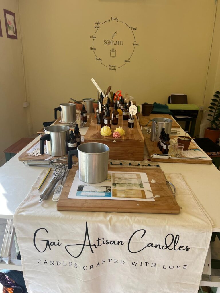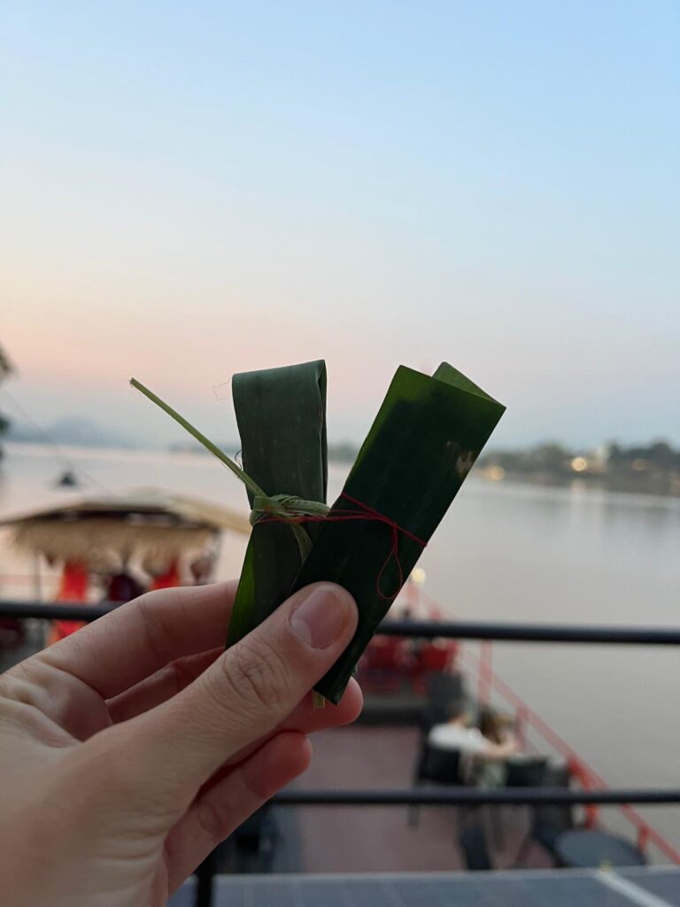 Das Gai Artisan Candles Artelier befand sich glücklicherweise auf unserer Seite des Flusses, sodass es gerade mal 8 Minuten zu Fuß entfernt war. Versteckt in einem total ruhigen und grünen Wohnviertel kam ich dort mit zwei weiteren Frauen aus Holland und den USA an. Gai, die super freundliche Besitzerin, empfing uns herzlich und hatte bereits alles vorbereitet. Das Ziel des Workshops war es, eine Duftkerze zu kreieren, die durch ihren Geruch an Dinge erinnern soll, die einen glücklich machen und motivieren. Mein Duft vereinte schlussendlich fruchtige Litschi, frische Bergamotte, einen Hauch von holzigem Weihrauch mit einer Basis aus blumiger Magnolie. Der Geruch soll einen aktivieren und Energie für den Tag liefern. 😊 Nachdem die Aromen mit flüssigem Wachs aufgegossen wurden, mussten wir eine halbe Stunde warten bis die Kerze ausgehärtet war. Gai zeigte uns in der Zwischenzeit wie in Laos traditionell Tee aufgegossen wird und richtete uns allen eine leckere Tasse Tee mit Gebäck an. Am Ende verpackte sie die Durftkerzen liebevoll in Papier und einem Stoffsäckchen, sodass wir sie sicher mit nach Hause nehmen konnten. Es hat wirklich sehr viel Spaß gemacht und unsere Gruppe hat sich so gut verstanden, dass wir drei Stunden zusammen verbrachten. 🍵🫖🕯️