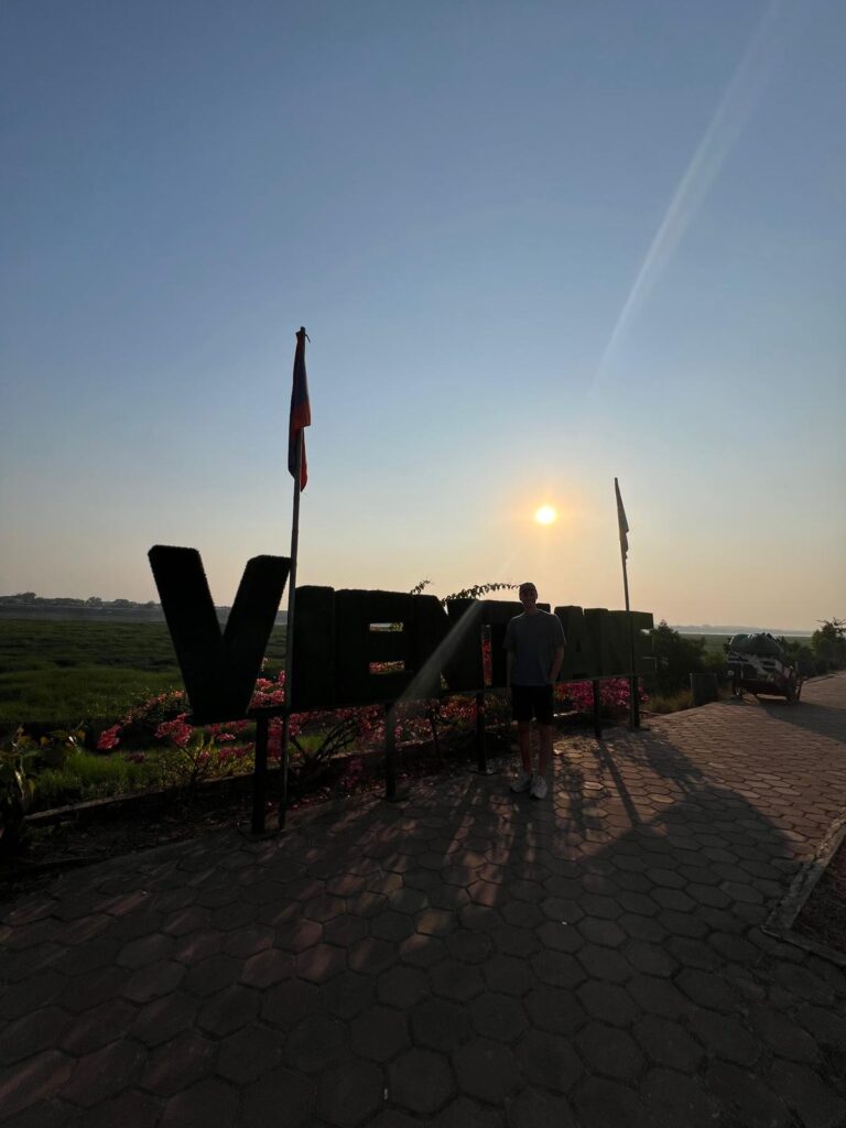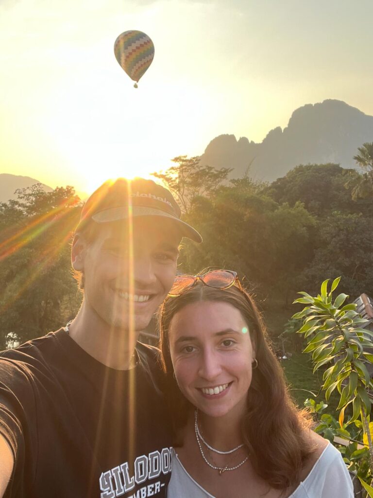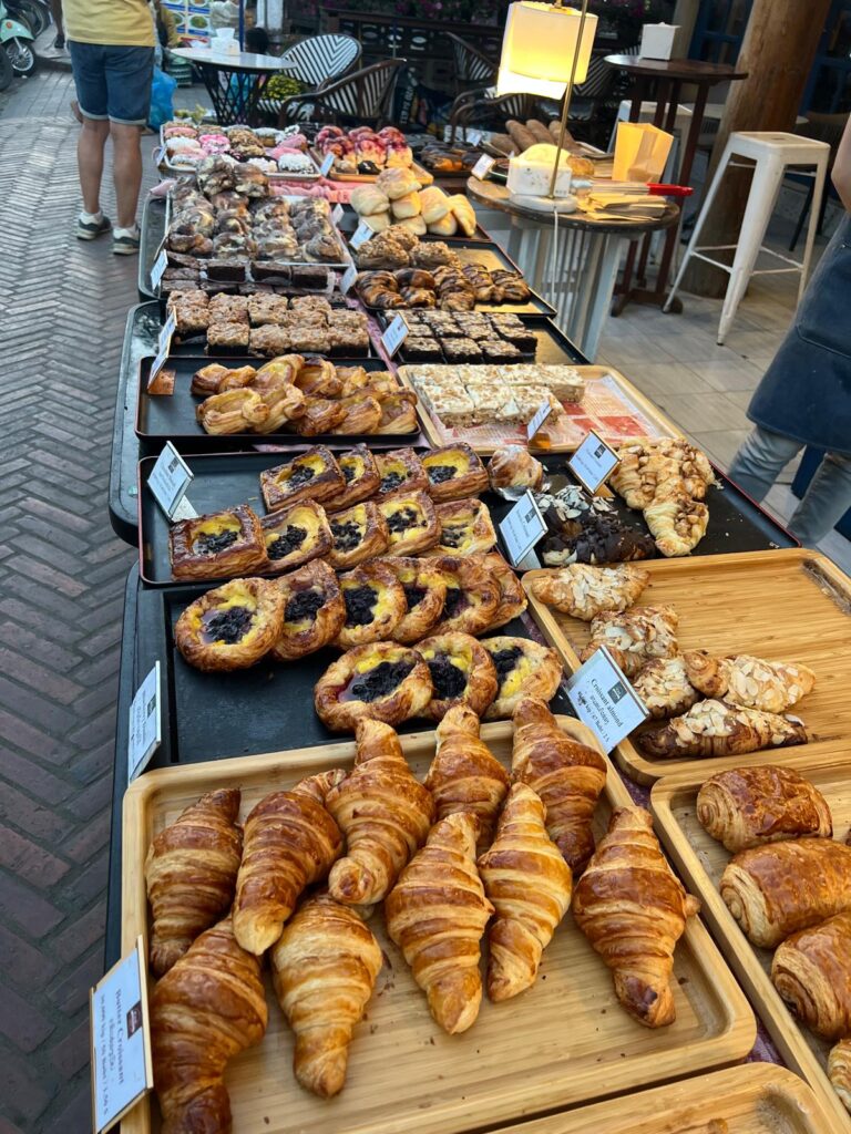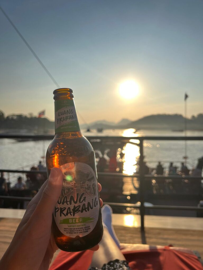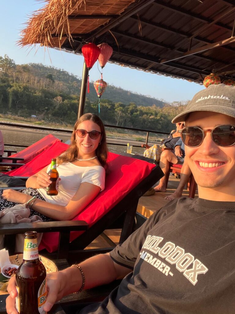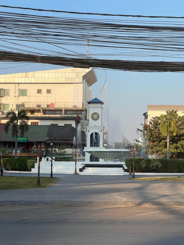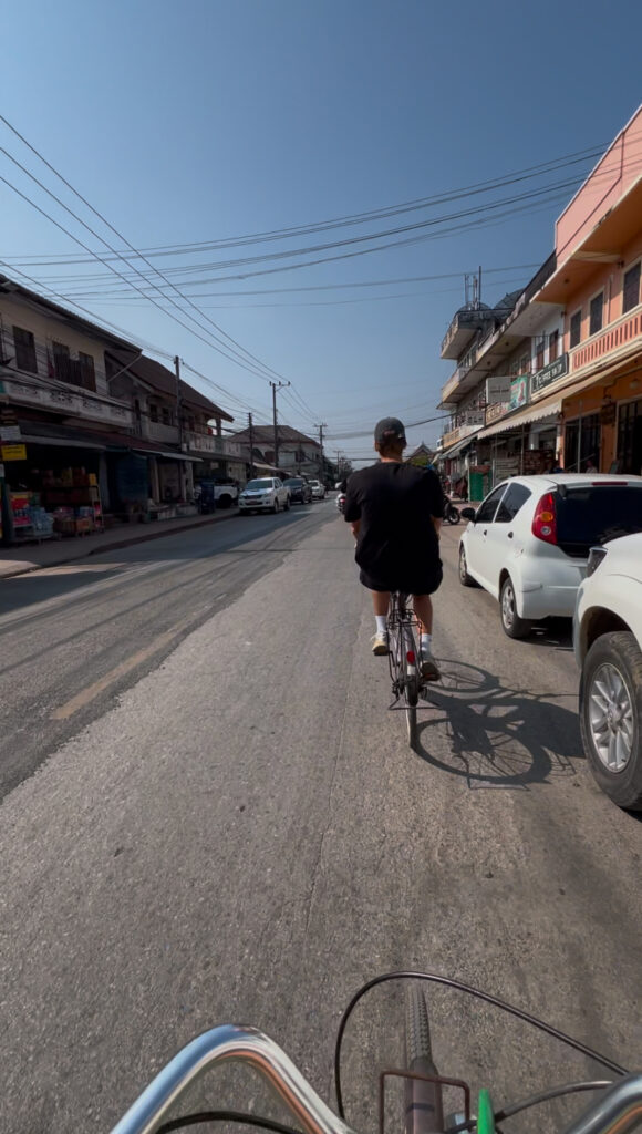 Den nächsten Tag ließen wir sicherheitshalber noch etwas langsam angehen. Zur Mittagszeit liehen wir uns zwei Fahrräder von unserem Hotel und machten uns auf den Weg zur Paketstation, um unser Taschenmesser per Post nach Vientiane vorzuschicken. Wir hatten gelesen, dass vor den Zugfahrten strenge Sicherheitskontrollen durchgeführt werden und bereits viele Touristen ihre Messer abgeben mussten. Zu unserem Erstaunen sprachen die Mitarbeiter von Hal Logistics relativ gutes Englisch und verlangten nicht mal einen Euro für den Versand. Zufrieden radelten wir (auf den viel zu kleinen Fahrrädern) zum Indigo Café und bestellten für Lukas einen magenschonenden Ingwer-Tee. Für Kristin gab es einen Kaffee mit einem Donut, zu dem es dann ausgerechnet noch einen zweiten gratis gab. 😄😋 Am Abend wollten wir einen Aussichtspunkt für gute Sonnenuntergänge auskundschaften, der durch die Brückenbaustelle eher ein Reinfall war und gönnten uns abschließend noch eine leckere Steinofenpizza.