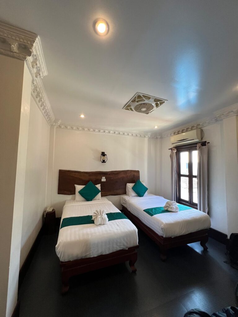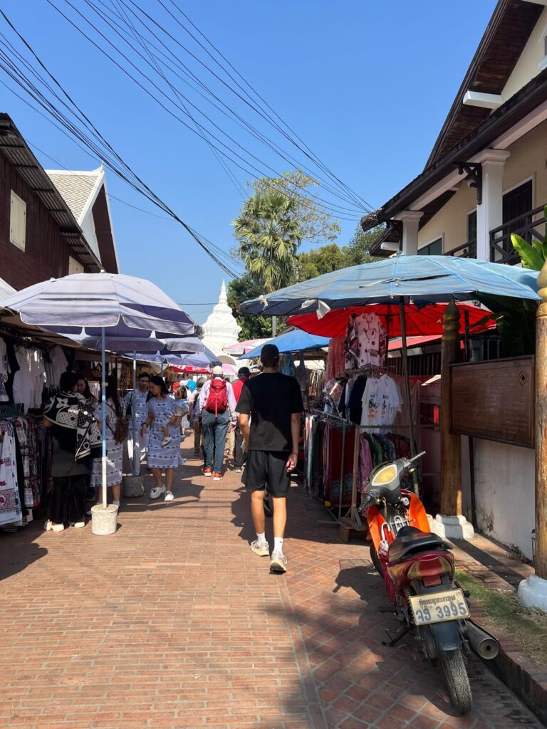 Unser Hotel Alana lag auf der anderen Seite des Nam Khan Flusses, der in der Stadt in den Mekong mündet. Normalerweise verbindet eine Bambusbrücke in der Nähe des Hotels beide Stadtseiten, die jedoch vor kurzem für den Bau einer neuen Brücke abgerissen wurde. Daher mussten wir leider einen fast 30 minütigen Umweg ins Zentrum laufen. Gleich nach unserer Ankunft begaben wir uns auf Erkundungstour und verbrachten den gesamten Nachmittag in der Stadt, bis abends der Night Market öffnete. Lukas fühlte sich anschließend leider gar nicht gut und hatte sich scheinbar irgendwo den Magen verdorben. Nach einer für ihn unangenehmen Nacht verbrachte er den kompletten Folgetag im Bett. Glücklicherweise gab es das kleine gemütliche Trikoff Café mit WLAN in derselben Straße, sodass Kristin dort ein paar Stunden arbeiten konnte. Anschließend entschied sie sich spontan an einem Kerzen-Workshop teilzunehmen.