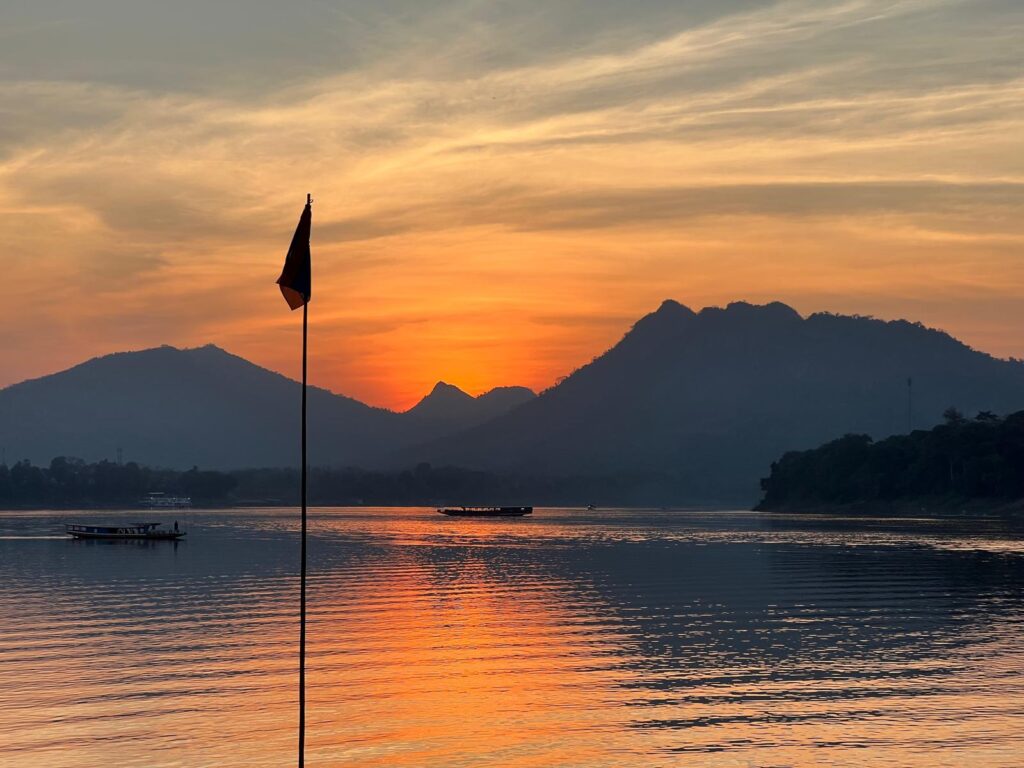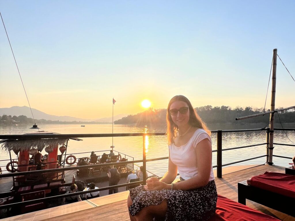 Am Abend stand unser kleines Highlight für diesen Aufenthalt an – eine Mekongbootsfahrt zum Sonnenuntergang. Typisch Deutsch kamen wir bereits eine Stunde vor Abfahrt und konnten uns so zwei der fünf besten Plätze sichern. Im Preis inbegriffen war jeweils ein Getränk nach Wahl sowie ein Snackteller. Auf unseren bequemen Liegen auf dem oberen Deck fuhren wir entspannt der Sonne entgegen und genossen die zweistündige Fahrt. Zum Abschluss konnte jeder Gast jeweils einen Wunsch und eine Bürde auf Bananenblätter schreiben, die dann über ein großes Becken in den Mekong gespült wurden.