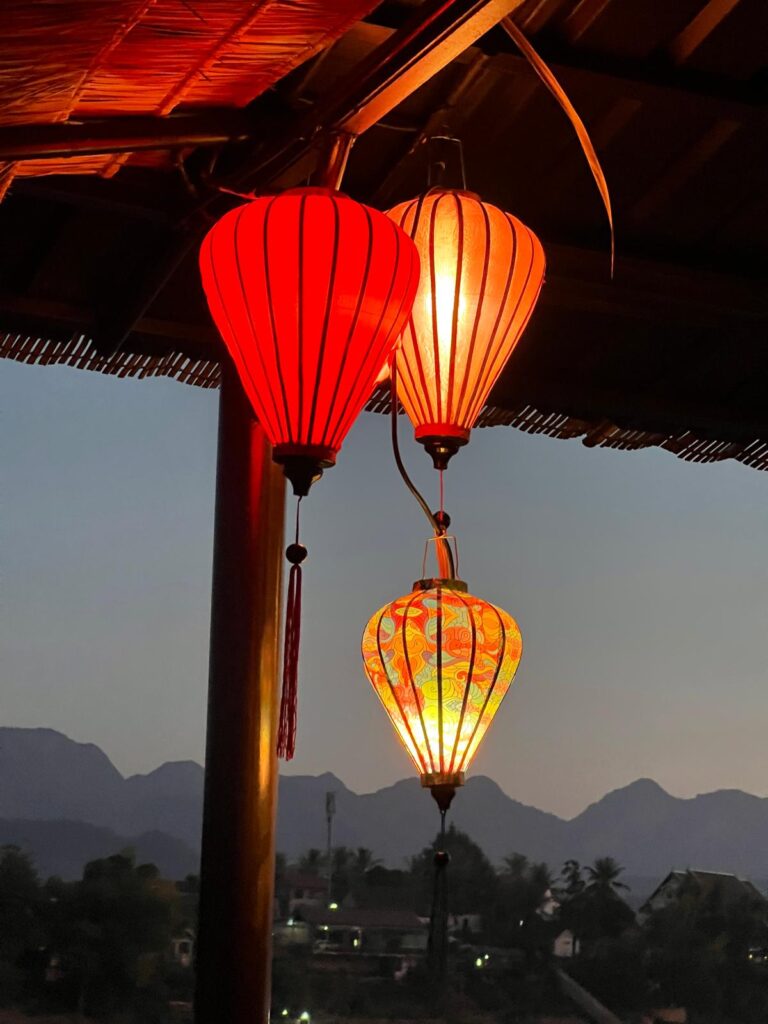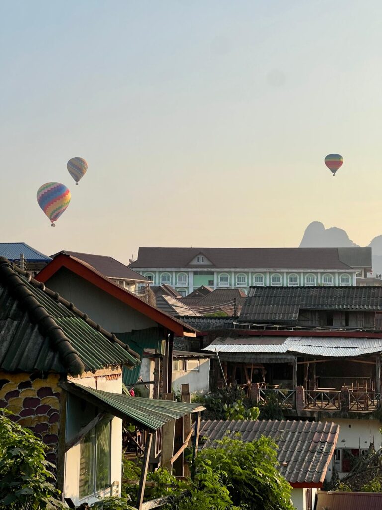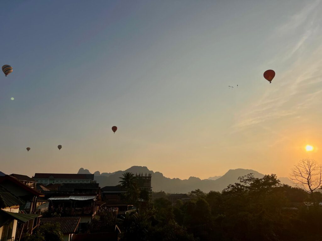 Auf Empfehlung von unserem Hostel gingen wir am späten Nachmittag zum Pullmind Café. Vang Vieng ist unter anderem sehr bekannt für Heißluftballonfahrten, die wir zum Sonnenuntergang perfekt von der Terrasse des Cafés bestaunen konnten. Es sah wirklich toll aus, wie die vielen Ballons vor der Berglandschaft der Sonne entgegen flogen. Wir ließen den Tag mit einem gemeinsamen Abendessen ausklingen und schlenderten auf dem Heimweg nochmal über den Night Market.