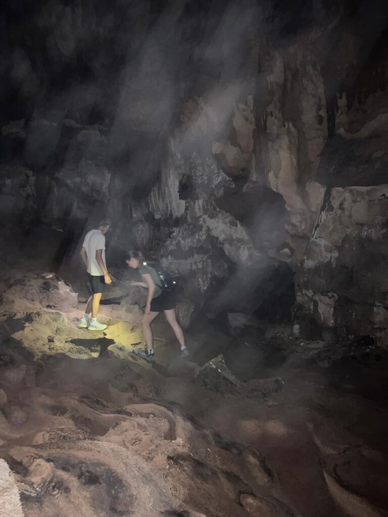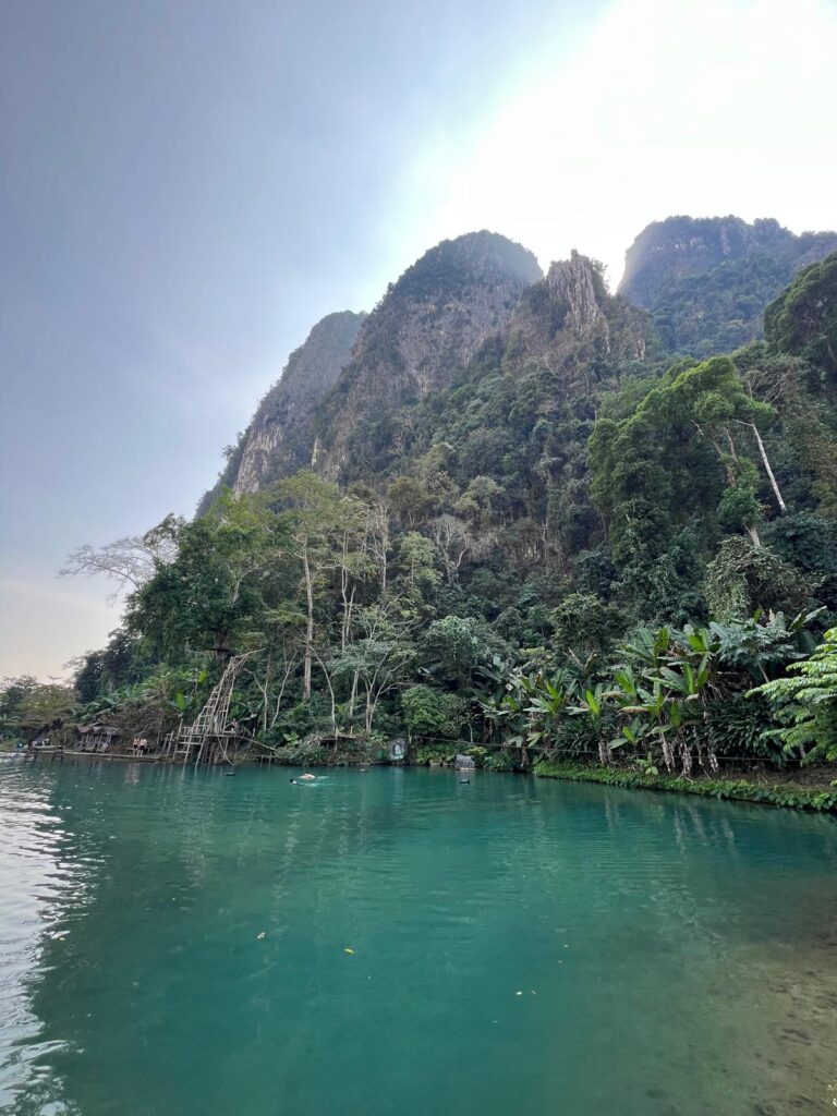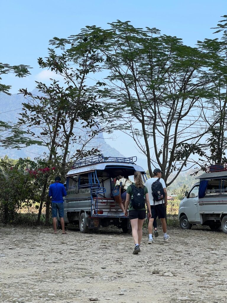 Für unseren Ausflug am nächsten Tag mieteten wir uns zu fünft ein privates Tuk Tuk für 35€, dass uns zu zwei verschiedenen blauen Lagunen und am Fuße eines Aussichtspunktes fahren sollte. Vang Vieng ist mit unzähligen natürlichen Lagunen umgeben, von denen sieben Stück zum Baden und Chillen geeignet sind. Passend zu unserer Route und abschließenden Wanderung wählten wir Blue Lagoon 2 und 3 aus. Die Lagune 3 hat uns sehr gut gefallen, da sie natürlicher wirkte und direkt an einem Berg gelegen ist. Wir sahen ein Schild, dass in den Berg hinein eine Höhle mit ebenfalls zwei Wasserpools führt. Zusammen mit Linda begaben wir uns zu dritt auf Erkundungstour. Der Einstieg in die Höhle war etwas versteckt über zwei klapprige Holzleitern und sehr eng, sodass wir uns zuerst unsicher waren, ob wir wirklich hineinkrabbeln wollen. Linda hatte online gesehen, dass scheinbar nur die ersten Meter wirklich eng sein sollen. Also kletterte Kristin mit ihrer Handytaschenlampe als erste hinab und schaute nach, ob das wirklich so stimmt. Tatsächlich konnte sie nach einigen Metern wieder normal stehen und rief die anderen zwei herbei. Obwohl es wirklich stockdunkel war, fühlten wir uns mit unseren drei Handylampen in der Hand sicher genug, um weiterzugehen. Da wir bis zu unserem Rückweg die einzigen in der Höhle waren, war die Erkundungstour spannend und wie ein kleines Abenteuer. Immer wieder entdeckten wir Pfeilmarkierungen an den Wänden, die uns den Weg bis zu den Pools und auch später zurück zum Ausgang zeigten. Zurück an der Lagune wunderten sich Lindas Freundinnen, wo wir die letzte Stunde waren.