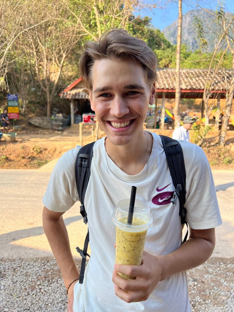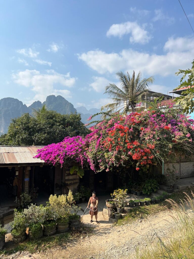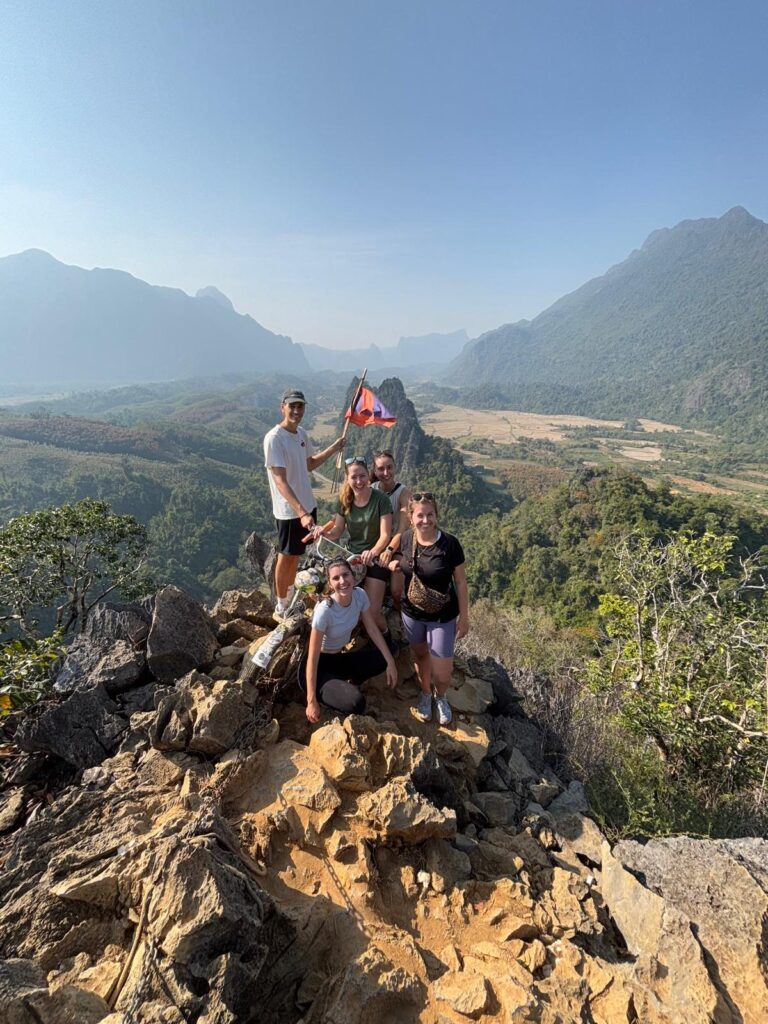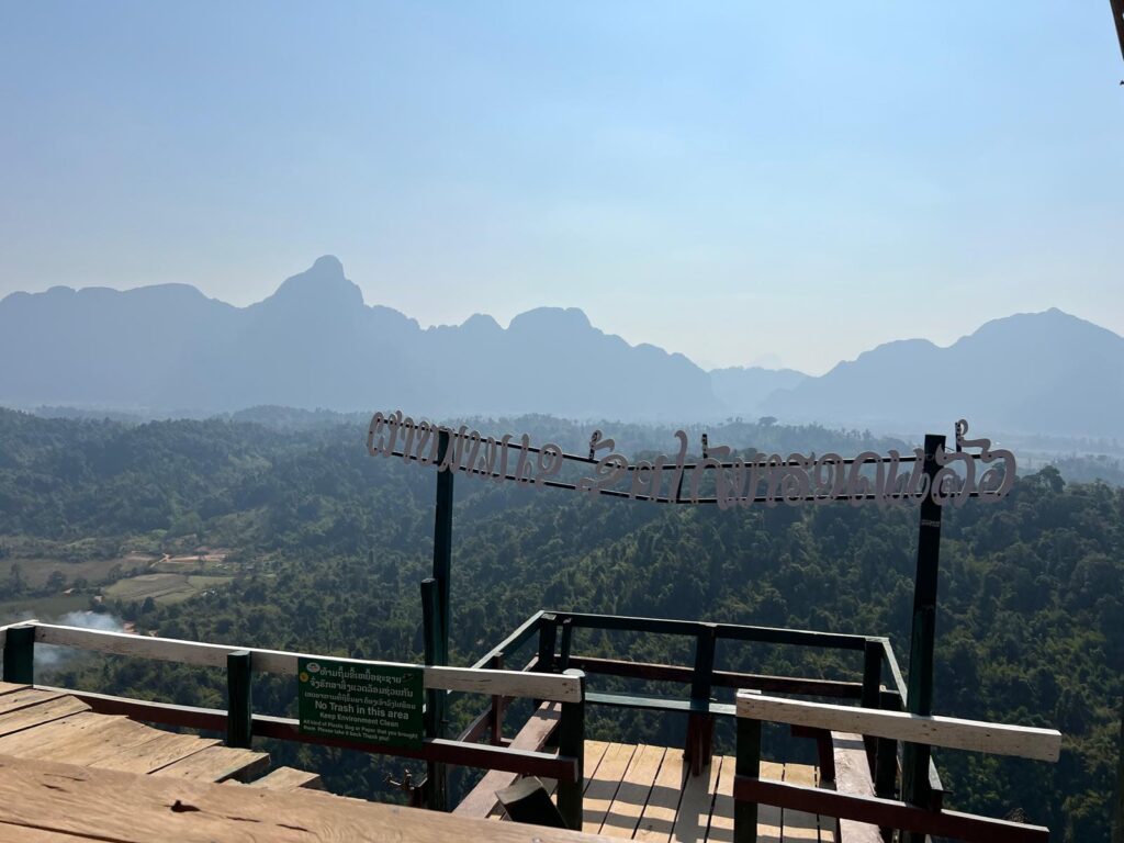 Wir brauchten jedenfalls erstmal eine Stärkung für die anstehende Wanderung und aßen ein paar Nudeln zu Mittag, bevor es anschließend zum Nam Xay Viewpoint ging. Der Aufstieg dauerte nur eine halbe Stunde, war dafür jedoch sehr steil. Oben angekommen erwartete und erneut ein 360 Grad Ausblick auf die wunderschöne Berglandschaft von Vang Vieng. Mit dem Motorrad auf dem Gipfel ist dieser Viewpoint besonders bekannt in Laos. Nach dem Abstieg gönnten wir uns direkt am Parkplatz noch einen Smoothie und wurden zurück zur Unterkunft gefahren.