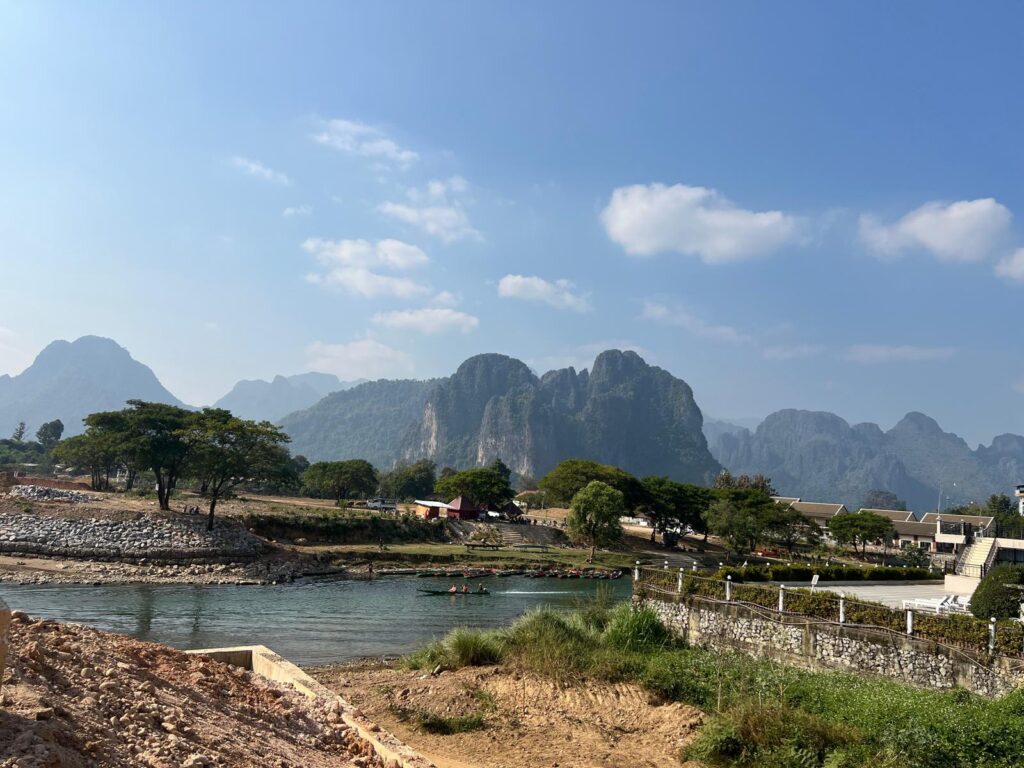 Die wilden Minivanfahrten in Laos hatten nun endlich ein Ende und es ging für uns früh morgens zum Bahnhof. Die chinesische Zugstrecke verbindet China mit der Hauptstadt Vientiane mit zwei weiteren Stopps in Luang Prabang und Vang Vieng. Nach gerade einmal einer Stunde sind wir pünktlich in Vang Vieng angekommen. Am Bahnhof standen bereits viele Tuk Tuks bereit, die einen zu fairen Preisen direkt zur Unterkunft fahren. Im Sabai Sabai Hostel trafen wir auf dem Weg zu unserem Zimmer direkt auf Kristins Freundin Linda! 😊 Mit ihr hat Kristin in Sindelfingen zusammen Volleyball gespielt und sie reist gerade ebenfalls mit zwei französischen Freundinnen durch Laos. Wir stellten unser Gepäck ab und gingen gleich gemeinsam zum Mittagessen, bei dem wir Pläne für den Rest- und Folgetag schmiedeten. Zuerst wollten wir den Fluss entlang die Stadt und eine empfohlene Höhle erkunden. Die Chang Tham Cave war zu unserer Überraschung viel größer als erwartet und innen sehr beeindruckend. Der Besuch wurde jedoch davon getrübt, dass vor dem Höhleneingang Elefanten zum Reiten und Streicheln gehalten werden. 😡