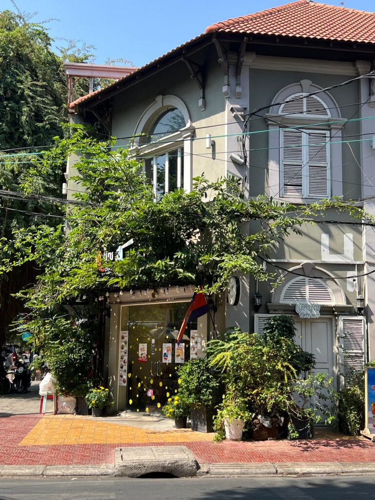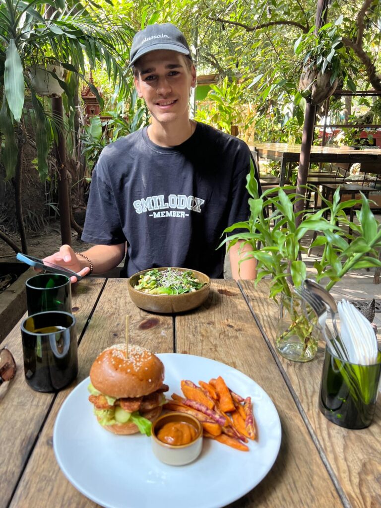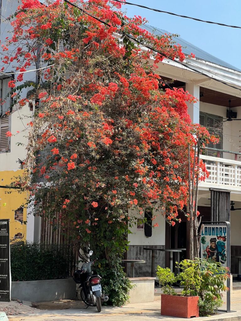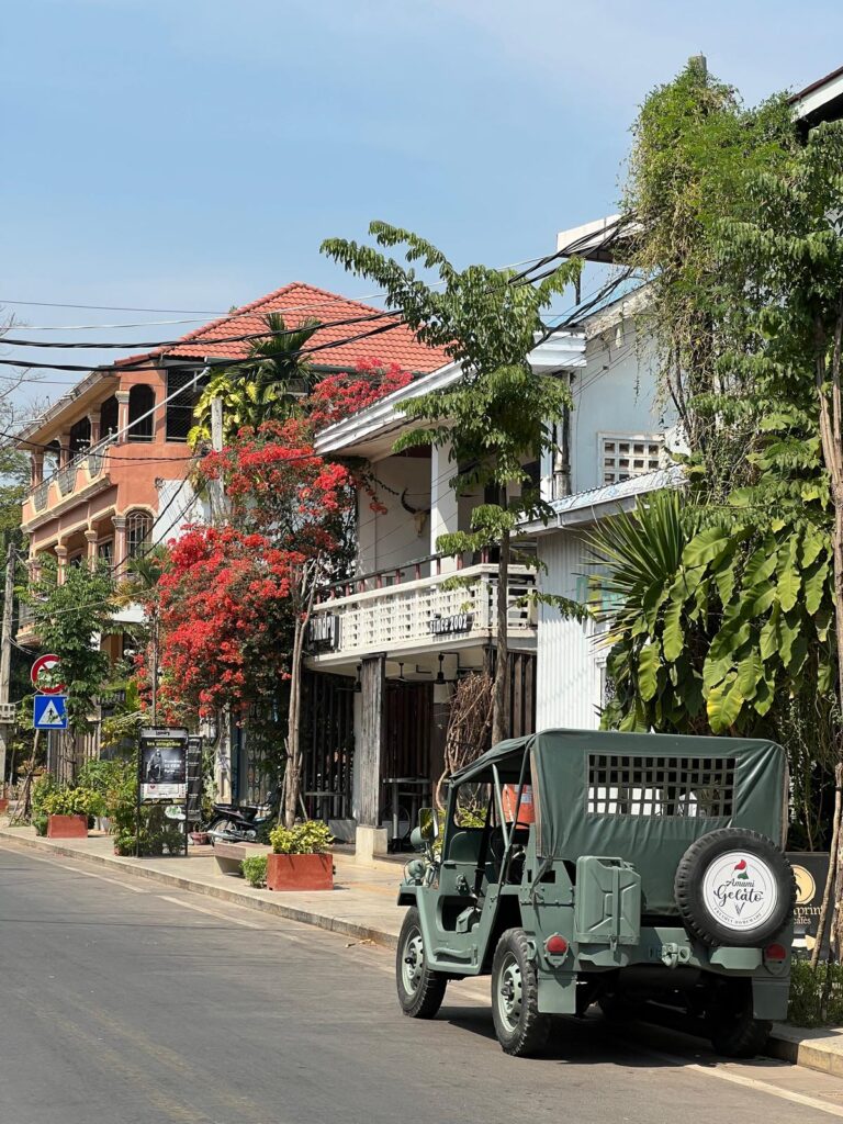 Am nächsten Morgen gingen wir nach dem Frühstück wie gewohnt zu Fuß los. In der Altstadt gab es wie immer einen kleinen Souvenirmarkt zu entdecken, viele schöne Cafés im französischen Stil und auch ein leckeres veganes Restaurant, das Banlle mit eigenem Gemüsegarten mitten in der Stadt. Anschließend gab es noch ein italienisches Eis auf die Hand und wir spazierten gemütlich den Fluss entlang zurück in unser Hotel. Nach einer mehrstündigen Siesta auf unserem Balkon, wollten wir uns einen Roller für unseren Angkor Wat Ausflug am Folgetag ausleihen. Dies haben wir direkt mit einem Abendessen auf dem Weg verbunden. Danach ging es für uns früh ins Bett, denn wir wollten zum Sonnenaufgang bereits am Tempel sein.