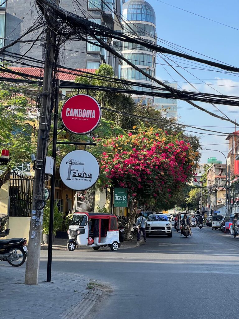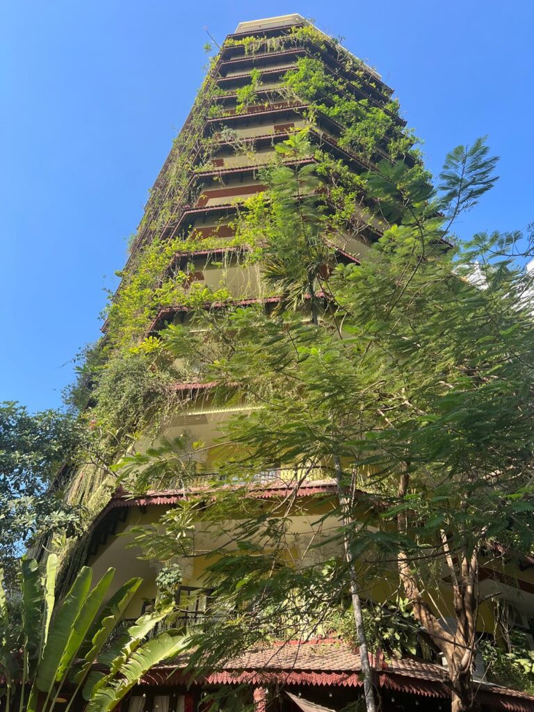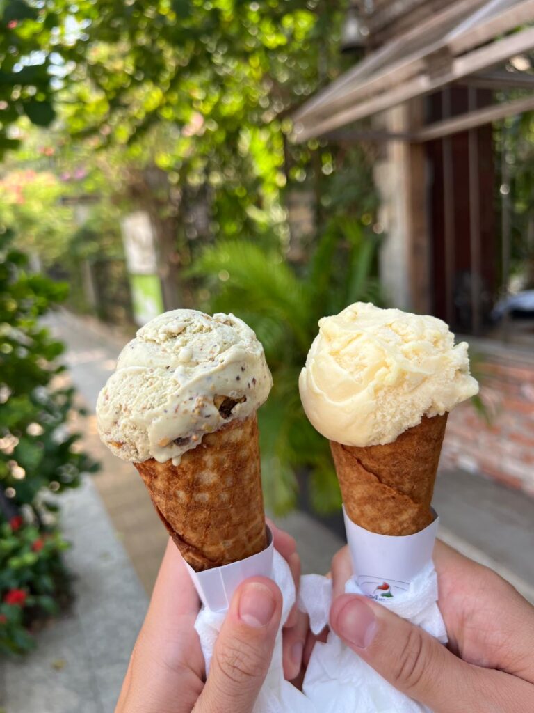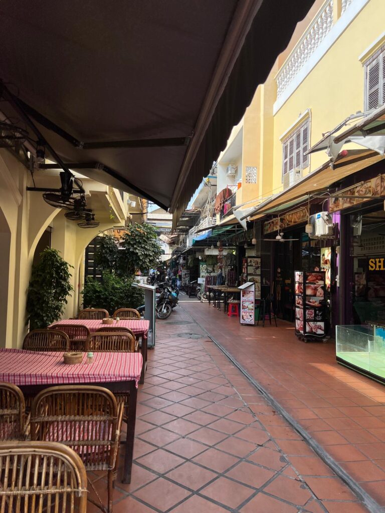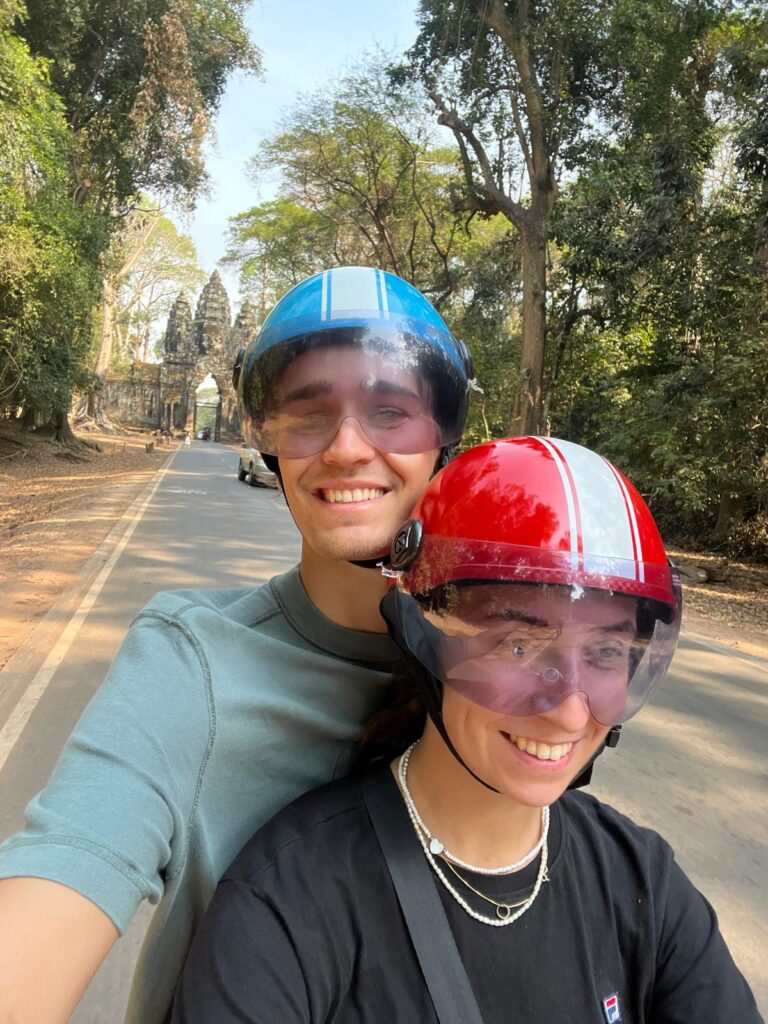 Am nächsten Morgen gingen wir nach dem Frühstück wie gewohnt zu Fuß los. In der Altstadt gab es wie immer einen kleinen Souvenirmarkt zu entdecken, viele schöne Cafés im französischen Stil und auch ein leckeres veganes Restaurant, das Banlle mit eigenem Gemüsegarten mitten in der Stadt. Anschließend gab es noch ein italienisches Eis auf die Hand und wir spazierten gemütlich den Fluss entlang zurück in unser Hotel. Nach einer mehrstündigen Siesta auf unserem Balkon, wollten wir uns einen Roller für unseren Angkor Wat Ausflug am Folgetag ausleihen. Dies haben wir direkt mit einem Abendessen auf dem Weg verbunden. Danach ging es für uns früh ins Bett, denn wir wollten zum Sonnenaufgang bereits am Tempel sein.