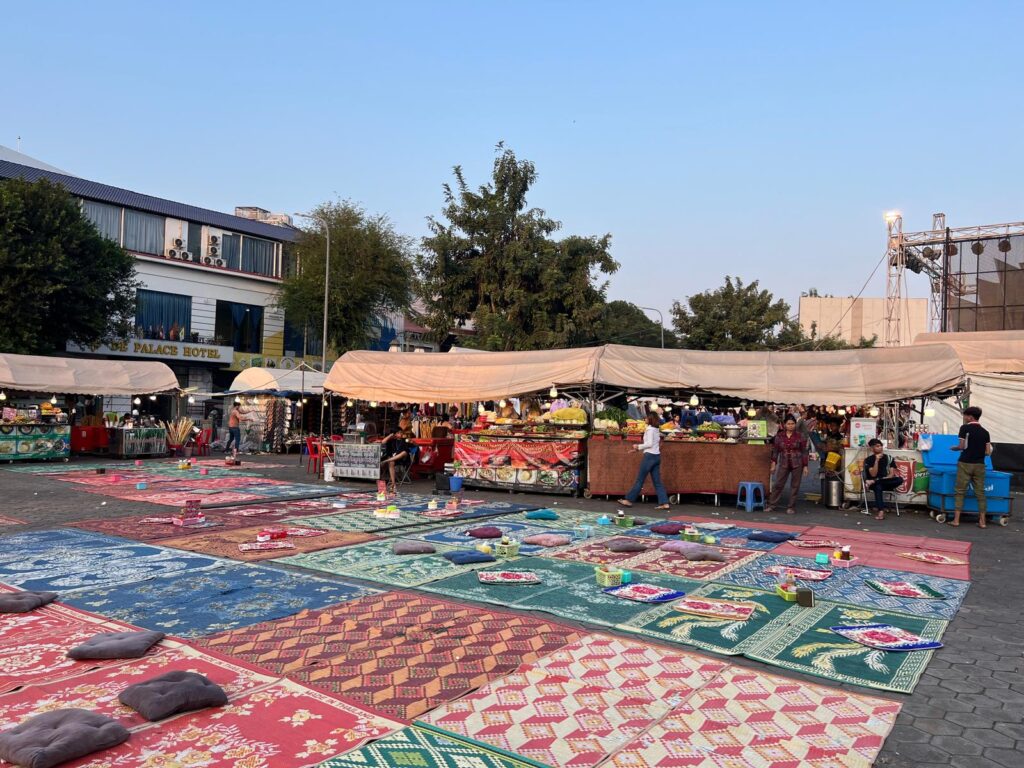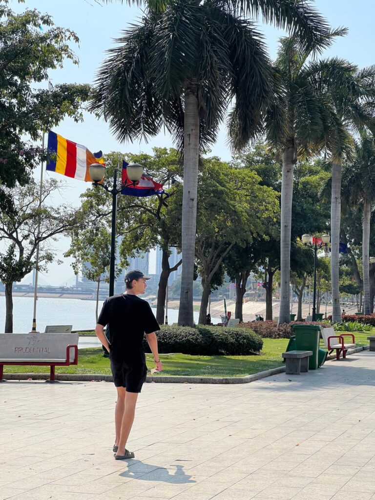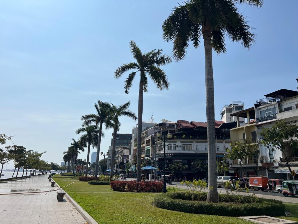 Am nächsten Morgen ging es um 10 Uhr mit dem Bus nach Phnom Penh. Glücklicherweise lag die Busstation sowohl beim Abfahrts- als auch beim Ankunftsort in unmittelbarer Nähe zu unseren Unterkünften, sodass wir die Wege in wenigen Minuten zu Fuß laufen konnten. Die Busfahrt dauerte knappe 5 Stunden und verlief reibungslos. Das X One Hotel liegt mitten in der Stadt direkt am Mekong, sodass wir den ersten Abend die Uferpromenade entlang spazieren konnten. Mit den Palmen und den gegenüberliegenden Gebäuden in französischem Baustil wirkt es ein wenig wie in Südfrankreich. Nachdem der Night Market essenstechnisch nicht so viel zu bieten hatten entschieden wir uns, mal wieder zu einem Inder zu gehen.