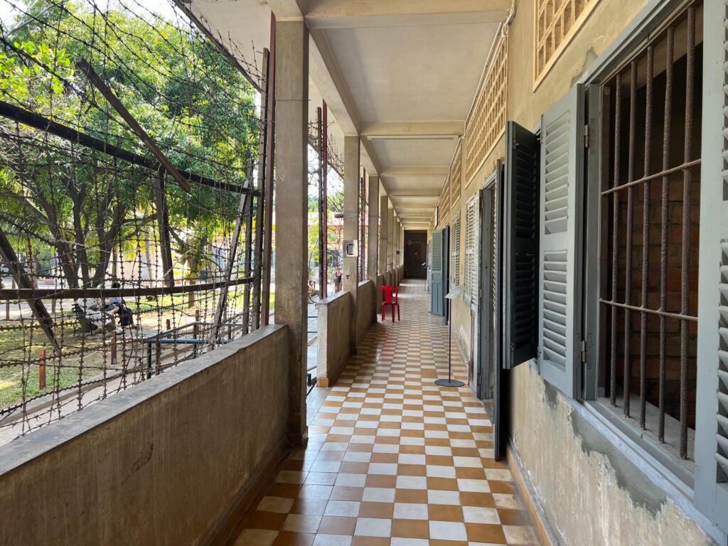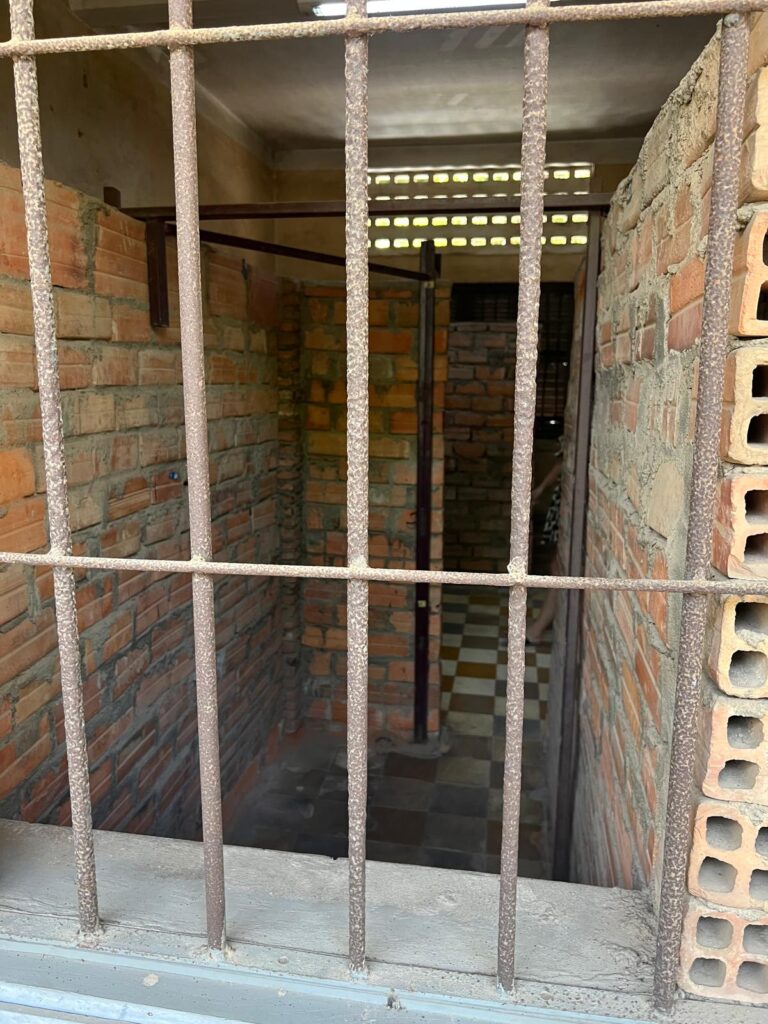 Als Tagesbeschäftigung für den darauffolgenden Tag suchten wir uns das ehemalige Gefängnis S-21 und heutige Tuol-Sleng-Genozid-Museum heraus. Hier wurden von 1975-1979 während der Schreckensherrschaft der Roten Khmer über 18.000 Menschen gefangen gehalten und gefoltert, von denen nur 12 überlebten. Mit Hilfe eines guten deutschen Audioguides verbrachten wir hier interessante und aufschlussreiche 3 Stunden. Hierbei führte uns die Tour durch die vier Hauptgebäude der umfunktionierten Tuol-Sleng-Grundschule, die immer noch originale Zellen und Folterinstrumente beinhaltet. Es ist erschreckend, dass in einigen Räumen scheinbar so viel Blut vergossen wurde, dass es den Boden nachhaltig verfärbte und gar nicht mehr zu reinigen ging. Im Innenhof saß sogar einer der 12 Überlebenden und signierte Bücher. Der Audioguide konnte einem die damaligen Geschehnisse gut vermitteln und uns diese dunkle Zeit von Kambodscha nahebringen, in der in kürzester Zeit über 2 Millionen Menschen starben. Wir hatten bis dato noch nie etwas davon gehört oder gelesen.