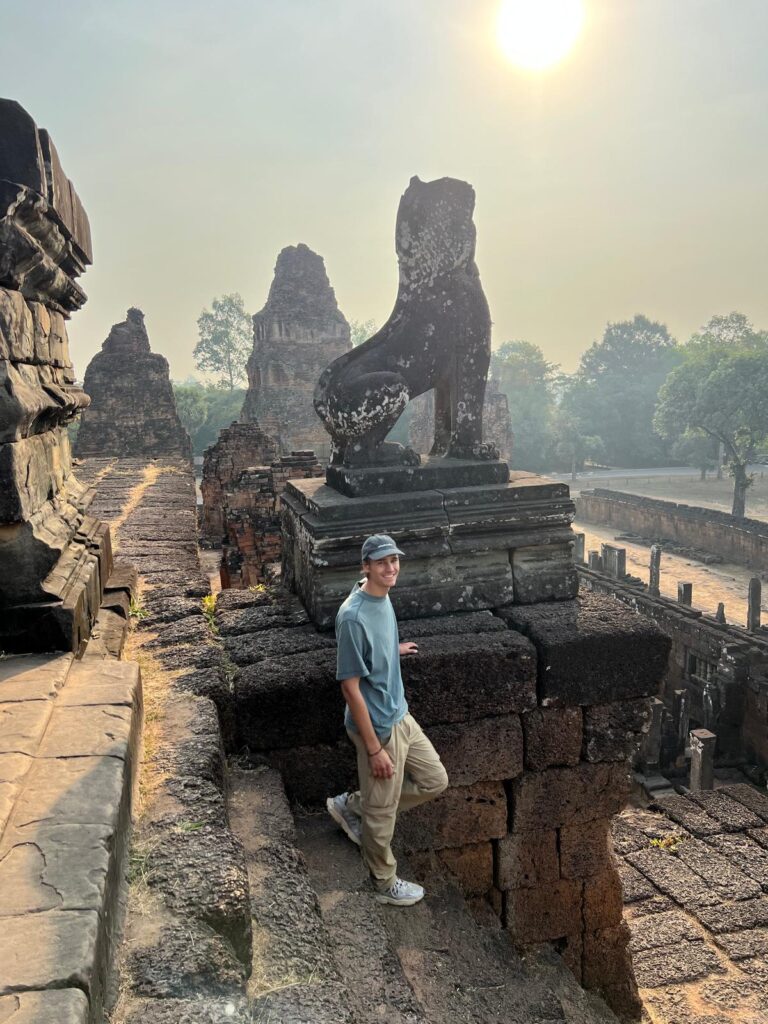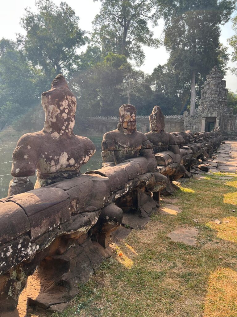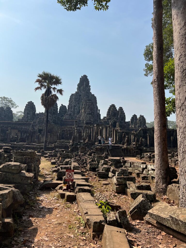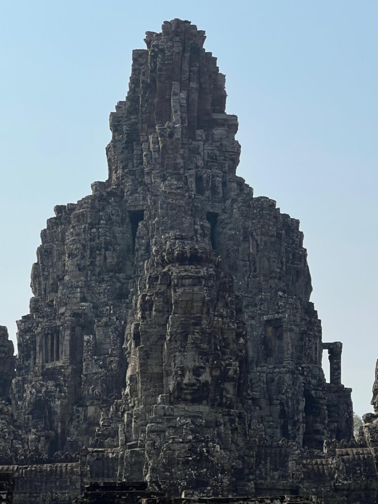 Auf dem Rundweg bis zurück zum Angkor Wat Haupttempel machten wir noch jeweils Halt beim Prasat Preha Tempel und dem Bayon Tempel. Alle Tempel sind auf ihre Art einzigartig und waren einst mit Wasserkanälen verbunden. Am Prasat Preha kann man noch heute eines der zwei größten Wasserspeicherbecken der damaligen Zeit betrachten. Der Bayon Tempel ist durch die riesigen in Stein gemeißelten Gesichter auf dem Turm bekannt, die von jeder Seite aus weiter Entfernung sichtbar sind.