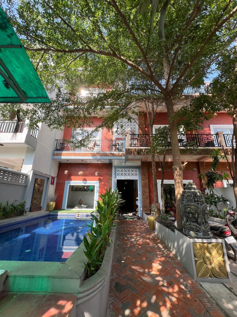 Wie bereits angekündigt verlief der Transfer nach Siem Reap leider nicht nach Plan. Anstelle der angekündigten 8 Stunden dauerte es mal wieder 11. Wir mussten mit einem Ersatzbus zur Grenze gefahren werden, da unser Bus sich auf dem Weg nach Laos verspätete und warteten dann auch noch nach Grenzübergang weitere 1,5h auf ihn. Ansonsten können wir nur berichten, dass es wirklich unglaublich war, wie lange die Ausreise aus Laos dauerte… Mal wieder nur zwei Häuschen besetzt und hunderte Menschen aus verschieden Reisebussen, die anstanden. Mit einem einfachen Stempel war es hier leider nicht getan, denn man erhielt bei der Einreise auch gleich schon eine Ausreisekarte aus Papier, die ungefähr jeder Zweite nicht mehr bei sich hatte. Deshalb verlangten die Grenzpolizisten 5$ pro verlorenen Zettel und es gab viele Diskussionen. Nachdem wir nun endlich im richtigen Bus auf dem Weg nach Siem Reap saßen standen weitere 7 Stunden Fahrt bevor. Immerhin wurden wir von dem Besitzer unserer Unterkunft an der Bushaltestelle abgeholt. Die Angkor Rithy Residence 2 liegt in einem ruhigen Stadtteil, hat einen eigenen kleinen Pool und sehr moderne Zimmer.