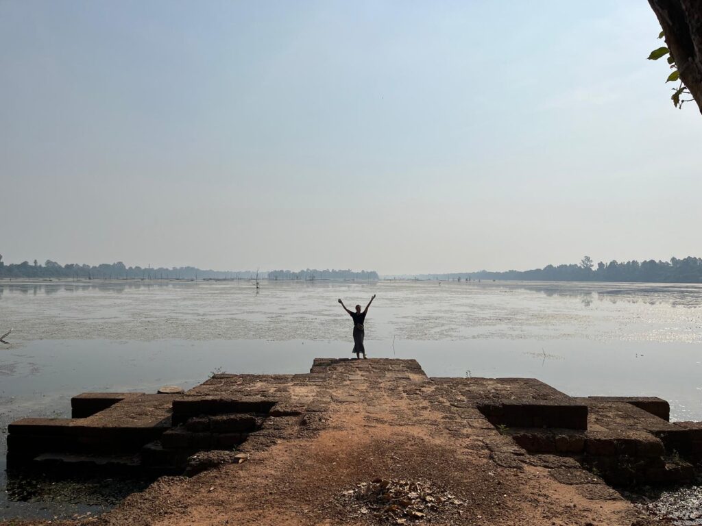 Die Tempelanlage von Angkor erstreckt sich über 1000 Quadratkilometer, weshalb wir uns vorher überlegen mussten, in welcher Reihenfolge wir vorgehen wollen. Den Sonnenaufgang wollten wir uns am Haupttempel Angkor Wat anschauen und anschließend die Tempel von Osten nach Westen abklappern. Angkor ist die größte antike Tempelanlage der Welt und war bis zum 15. Jahrhundert die größte Stadt Indochinas. Da bereits um um 6:30 Uhr tausende Menschen in den Angkor Wat strömten, entschieden wir uns ihn fürs erste nur von weitem zu betrachten und schnellstmöglich in den menschenleeren Osten zu fahren.
