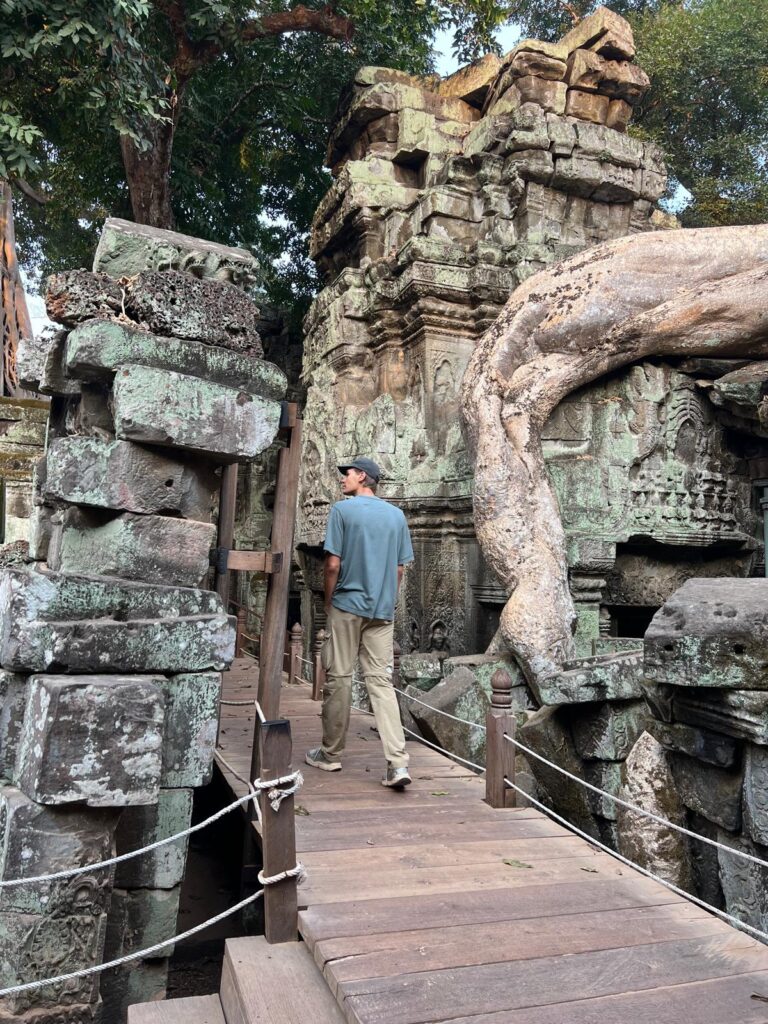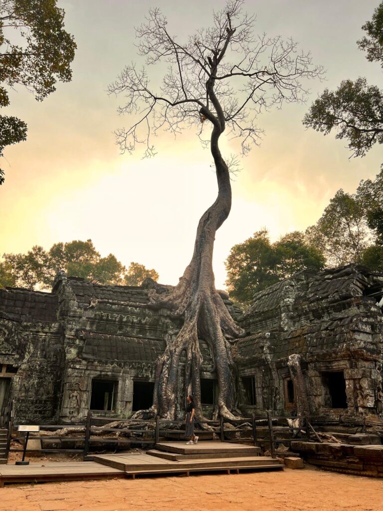 Fünfzehn Minuten später am Ta Prohm Tempel angekommen stellten wir fest, dass unser Plan aufging. Wir waren nahezu die Einzigen und konnte in Ruhe die aufgehende Sonne hinter den Bäumen bestaunen. Dieser Tempel ist etwas ganz Besonderes, denn er ist über die Jahre mit riesigen alten Bäumen zugewachsen. Wir können auch gleich vorwegnehmen, dass uns dieser Tempel mit Abstand am besten gefallen hat. Der Anblick, wie sich die Natur über die Jahre ihren Platz zurücknimmt, ist echt faszinierend!