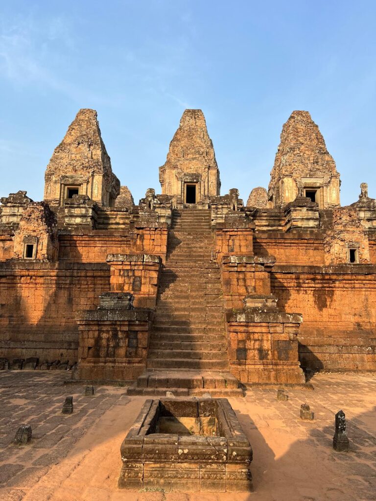 Danach ging es weiter zum Pre Rup Tempel. Diese Anlage war zwar etwas kleiner, aber nicht weniger beeindruckend. Hier konnten wir über große Steintreppen bis zu den drei Stupas (buddhistische Gedenkstellen) hinaufsteigen und auf den umliegenden Dschungel blicken. Langsam stand auch die Sonne höher und es wurde immer wärmer, weshalb wir schnell wieder in den Schatten des Waldes zum nächsten Tempel flohen.