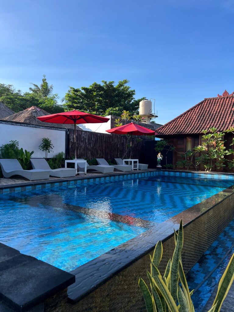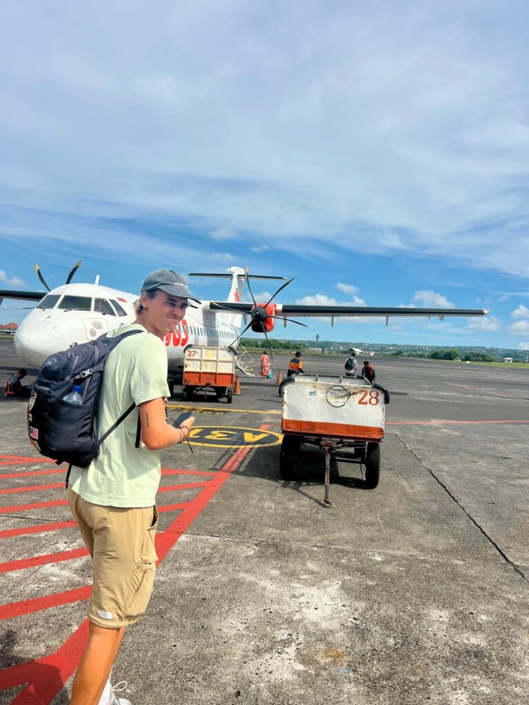 Am nächsten Vormittag ging es für uns zurück auf die Hauptinsel Bali. Da wir die letzten Nächte nur mittelmäßig geschlafen und mit kaltem Wasser duschen mussten, gönnten wir uns eine Zwischennacht im Hilton Hotel am Flughafen. Dort ließen wir den Tag am riesigen Pool mit einem super leckeren Abendessen und zwei Cocktails ausklingen. Für gerade mal 60€ für uns beide inklusive herausragendem Frühstücksbuffet war das auch mehr als drin! 😌😎 Von dort aus flogen wir mit einer abenteuerlichen Propellermaschine in unter einer Stunde auf die Nachbarinsel Lombok, wo wir jetzt erstmal 16 Nächte verbringen werden.