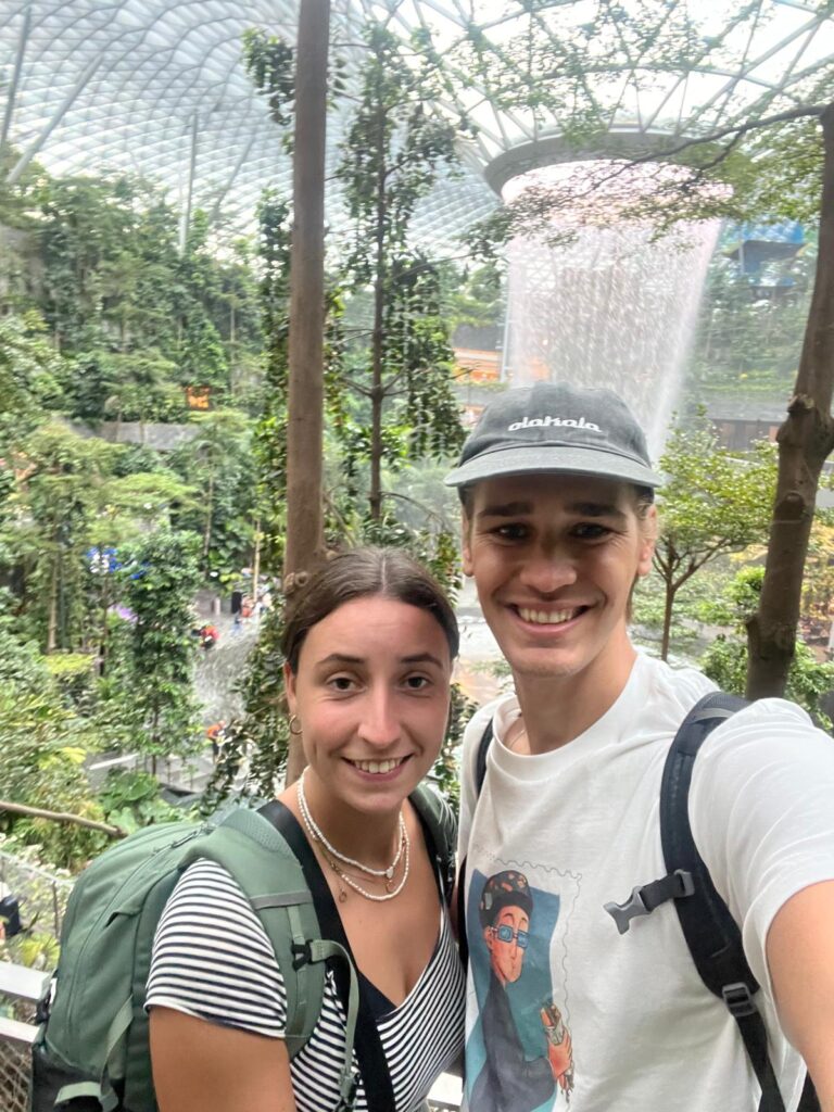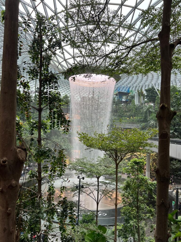 Am 02. April landeten wir am späten Nachmittag am weltberühmten Changi Flughafen in Singapur. Da unsere großen Rucksäcke Gottseidank durchgecheckt wurden und wir sie nicht mit uns herumschleppen mussten, ließen wir es uns nicht nehmen, den Flughafen ein wenig zu erkunden. Im Zentrum des Flughafens mit insgesamt vier Terminals befindet sich das riesige Einkaufszentrum The Jewel. Es ist einem großen Glasjuwel nachempfunden, in welchem die Geschäfte über vier Stockwerke hinweg um einen großen Indoor Wasserfall mit tropischen Pflanzen angesiedelt sind.