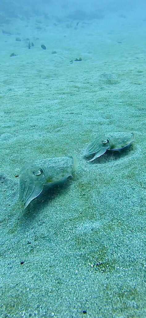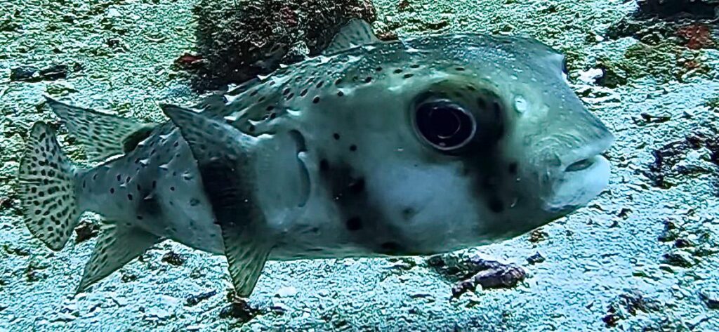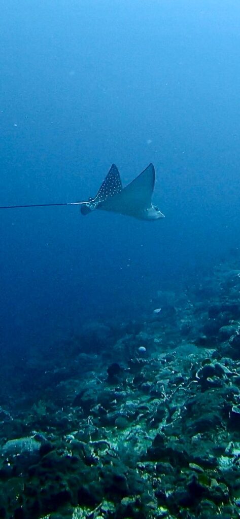 Am Folgetag ging es für drei Tauchgänge in den Norden von Nusa Penida. Durch die dort herrschenden Strömungen weiß man nie, welche großen Fischen einen erwarten können. Gleich bei unserem ersten Tauchgang sahen wir einen wunderschönen Adlerrochen. Da dieser sehr scheu und daher selten zu sehen ist, machte er sich auch schnell wieder aus dem Staub. Des Weiteren sahen wir einige Schildkröten, coole Froschfische und kleine Nudi Schnecken. Der dritte und letzte Tauchgang fand an der Nordküste von Nusa Lembongang statt. Hier machten wir einen super lustigen Drift-Dive bei starker Strömung ohne großartig selbstständig paddeln zu müssen. Dabei sahen wir einen rieeeeesigen Kugelfisch und einen mindestens 1,20m langen Barracuda! Für den letzten Tauchtag ging es erneut zum Manta Point und Crystal Bay. Neben erneut einigen Mantas sahen wir am Crystal Bay dieses Mal ein paar kleine Tintenfische im Sand, Kristins Lieblingsfisch, den süßen Porcupine Kugelfisch und viele wunderschöne bunte Korallen umgeben von Fischschwärmen.