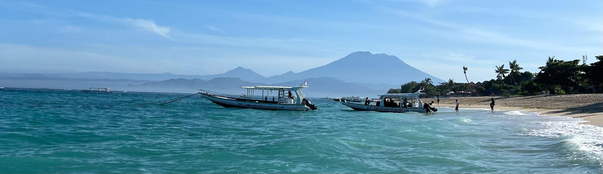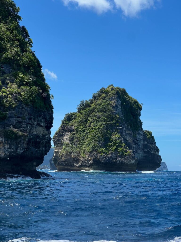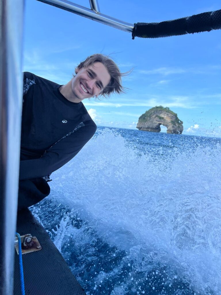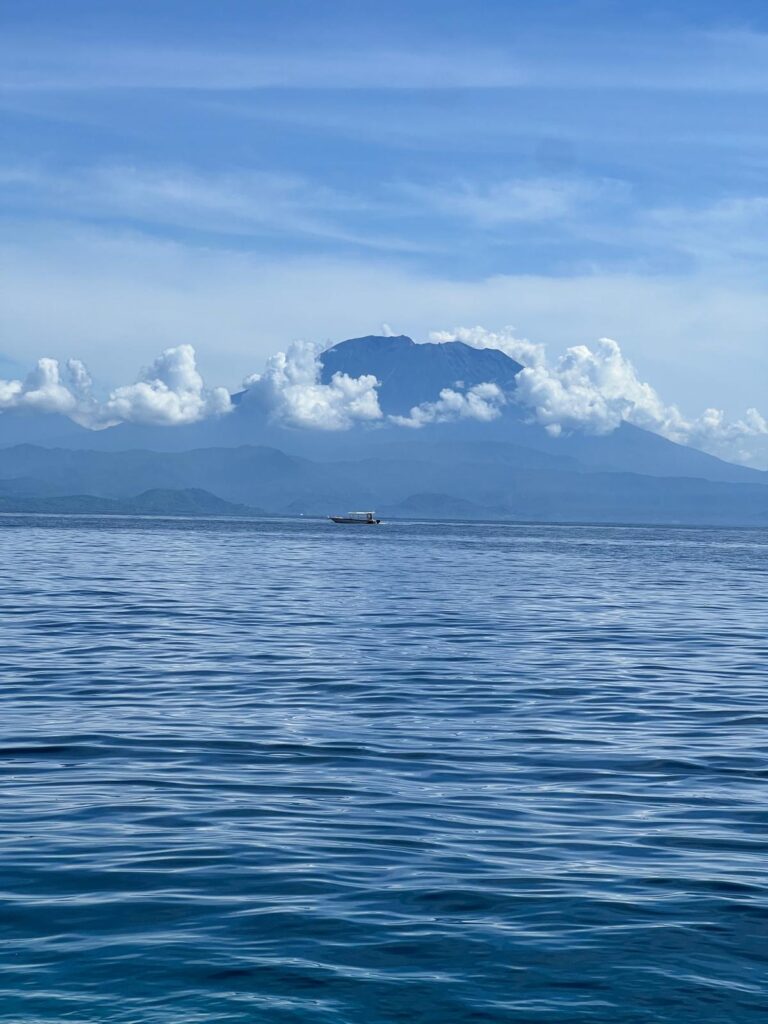 Darüberhinaus haben wir uns kurzfristig dazu entschieden, eine Zertifizierung zum Nitroxtaucher zu machen. Nitrox ist ein Atemgasgemisch aus Stickstoff und Sauerstoff mit einem höheren Sauerstoffanteil als normale Luft. Dies erlaubt einem das Tauchen mit einer höheren Sauerstoffsättigung, was einem wiederum ermöglicht, länger tiefer zu tauchen. Hierfür mussten wir lediglich einen halben Tag Theorie lesen und zwei kurze online Prüfungen ablegen. Am nächsten Morgen startete um 8:30 Uhr unser erster Tauchgang am Manta Point bei Nusa Penida. Allein die Bootsfahrt war schon wunderschön mit den vielen grünen Klippen im Kontrast zum tiefblauen Wasser. Immer wieder konnten wir in der Ferne den beeindruckenden über 3000 Meter hohen Gunung Agung Vulkan von Bali sehen.