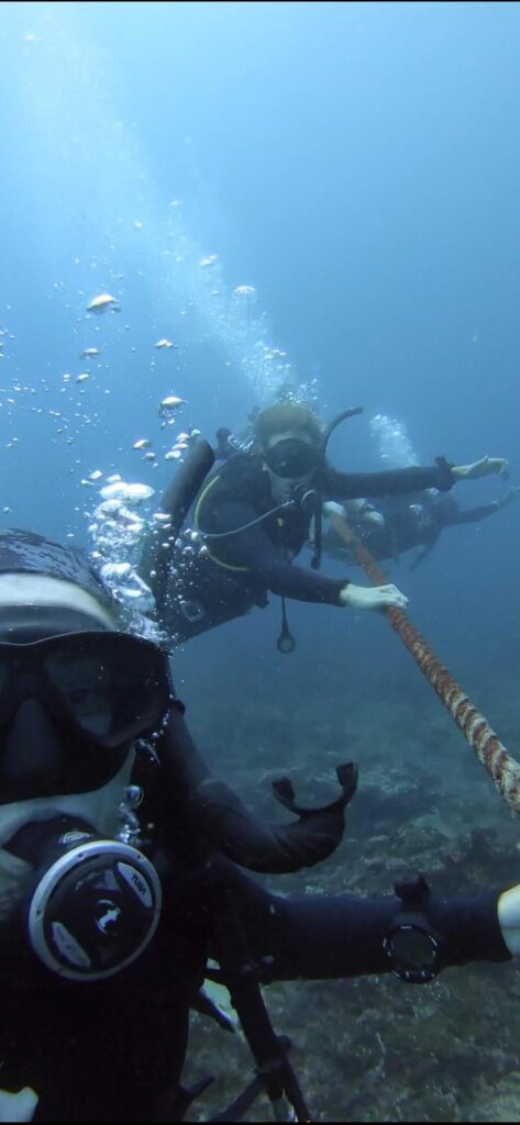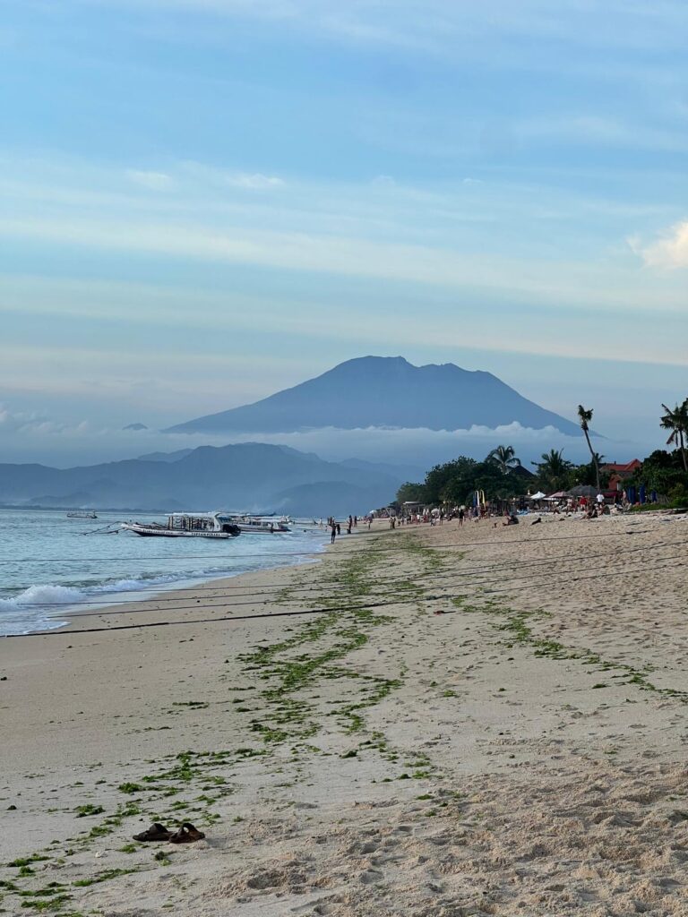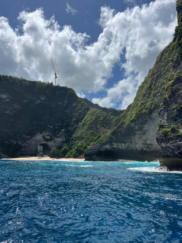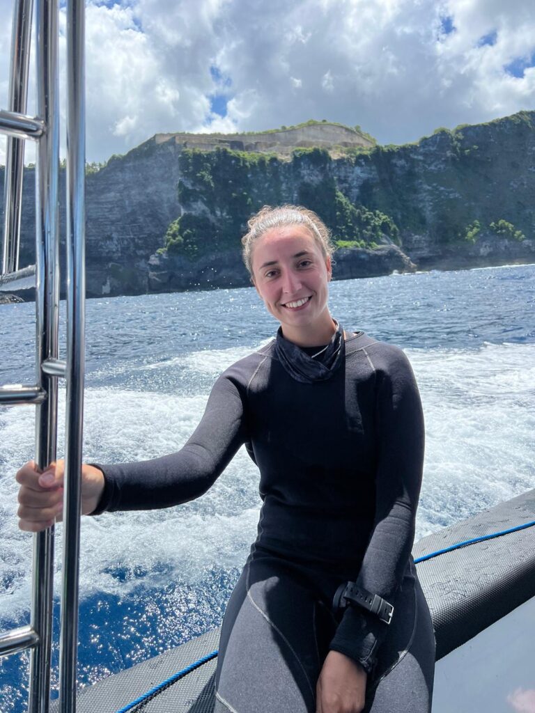 Darüberhinaus haben wir uns kurzfristig dazu entschieden, eine Zertifizierung zum Nitroxtaucher zu machen. Nitrox ist ein Atemgasgemisch aus Stickstoff und Sauerstoff mit einem höheren Sauerstoffanteil als normale Luft. Dies erlaubt einem das Tauchen mit einer höheren Sauerstoffsättigung, was einem wiederum ermöglicht, länger tiefer zu tauchen. Hierfür mussten wir lediglich einen halben Tag Theorie lesen und zwei kurze online Prüfungen ablegen. Am nächsten Morgen startete um 8:30 Uhr unser erster Tauchgang am Manta Point bei Nusa Penida. Allein die Bootsfahrt war schon wunderschön mit den vielen grünen Klippen im Kontrast zum tiefblauen Wasser. Immer wieder konnten wir in der Ferne den beeindruckenden über 3000 Meter hohen Gunung Agung Vulkan von Bali sehen.