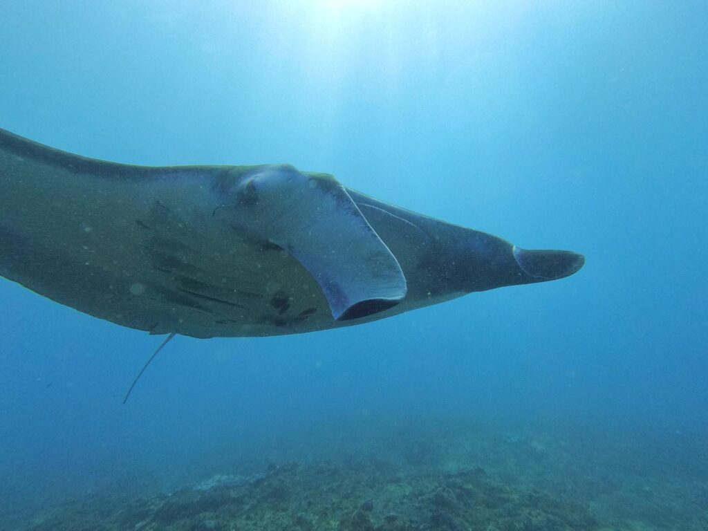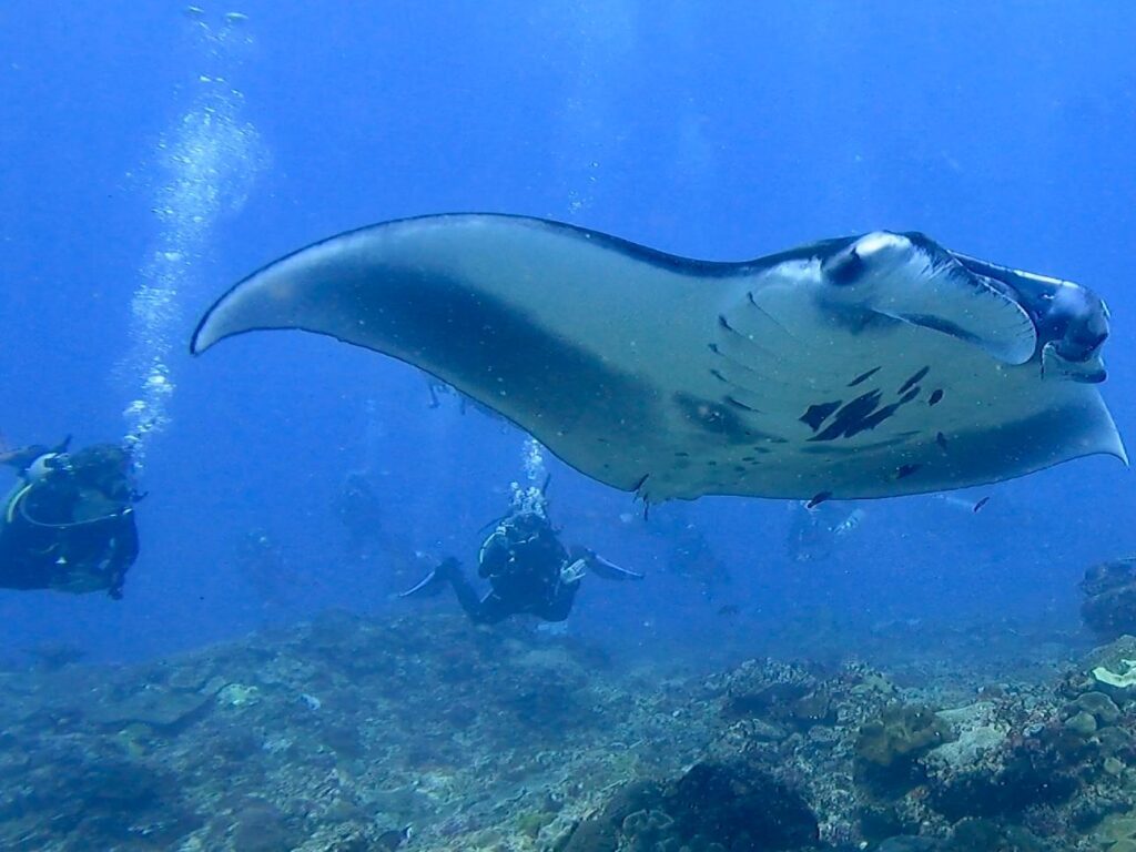 An dieser Tauchstelle befindet sich auf einem Felsen Unterwasser eine Putzstation, die täglich unzählige Mantarochen anzieht, um von kleinen Putzerfischen gereinigt zu werden. Mit unserem Guide Rian und zwei weiteren Personen tauchten wir ab und konnten tatsächlich mindestens zehn verschiedene riesige Mantarochen während unseres einstündigen Tauchgangs bestaunen. Wir hatten scheinbar richtig Glück und es passierte immer mal wieder, dass solch ein Gigant auf uns zu und knapp über unsere Köpfe hinweg schwamm. Es war definitiv der bisher atemberaubendste Tauchgang von uns beiden.