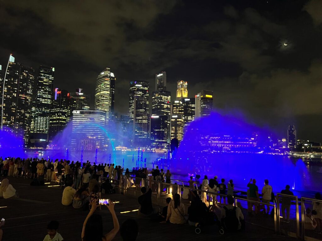 Ins Stadtzentrum gelangten wir in knapp einer Stunde bequem mit der Metro und checkten am frühen Abend in unser Hotel lyf Bugis Singapore ein. Nach einer kurzen Stärkung fuhren wir auf direktem Wege zum Marina Bay Harbour. Zu Fuß klapperten wir von dort aus die berühmten Wahrzeichen im Zentrum der Stadt ab. Dazu zählen das Marina Bay Sands Hotel, die Gardens of Bay, die Helix Brücke und die Wassershow an der Merlin Löwenstatue. Auch nach Sonnenuntergang herrschten hier tropische Temperaturen in der Nähe des Äquators, sodass wir nassgeschwitzt zurück im Hotel ankamen.