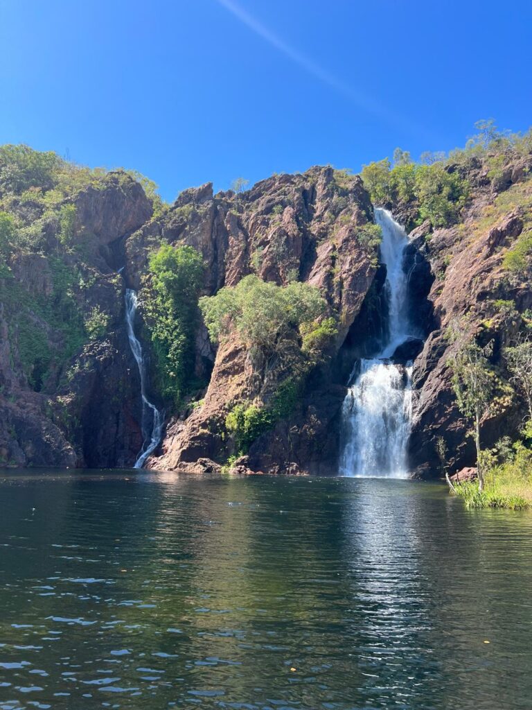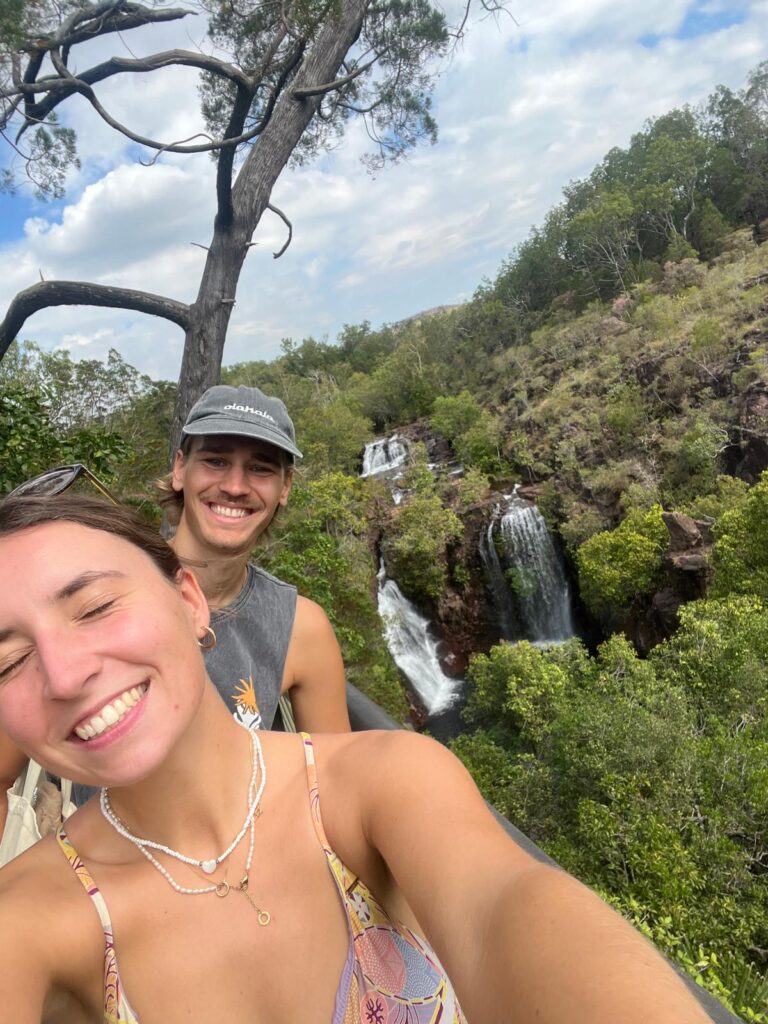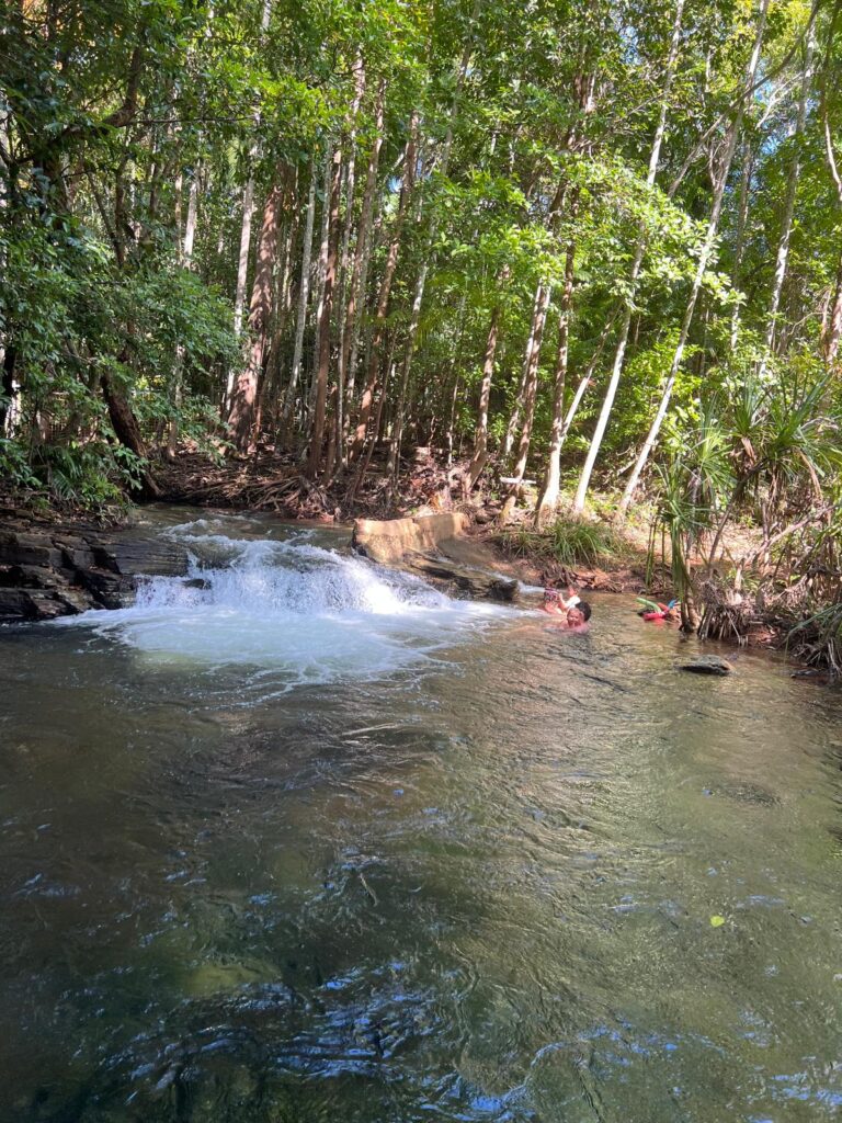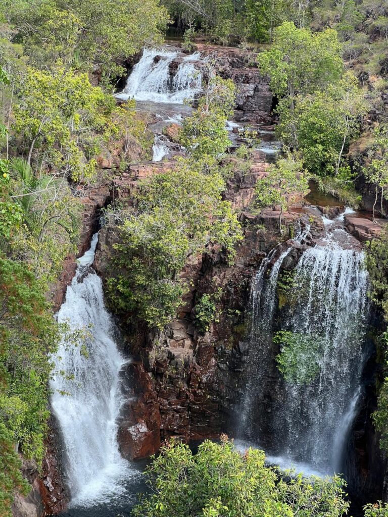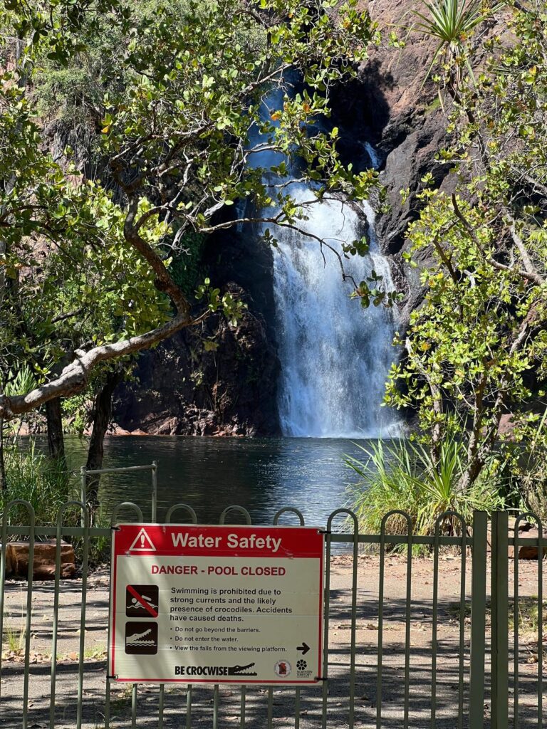 Weiter ging es zu den Wangi Falls, wo wir auch unseren Campingplatz gebucht hatten. Hier wollten wir auch mit baden und entspannen den restlichen Tag verbringen. Leider war das Becken durch den gestiegenen Wasserspiegel und der erhöhten Gefahr von Salzwasserkrokodilen gesperrt. Etwas enttäuscht mussten wir spontan umplanen, was sich ohne Netz schwierig gestaltete. Auf einem Lageplan konnten wir sehen, dass die Florence Falls nur 30km entfernt liegen und es dort auch Bademöglichkeiten gibt. Hier hatten wir mehr Glück und konnten noch ein paar Stunden im frischen kühlen Wasser plantschen. 💦