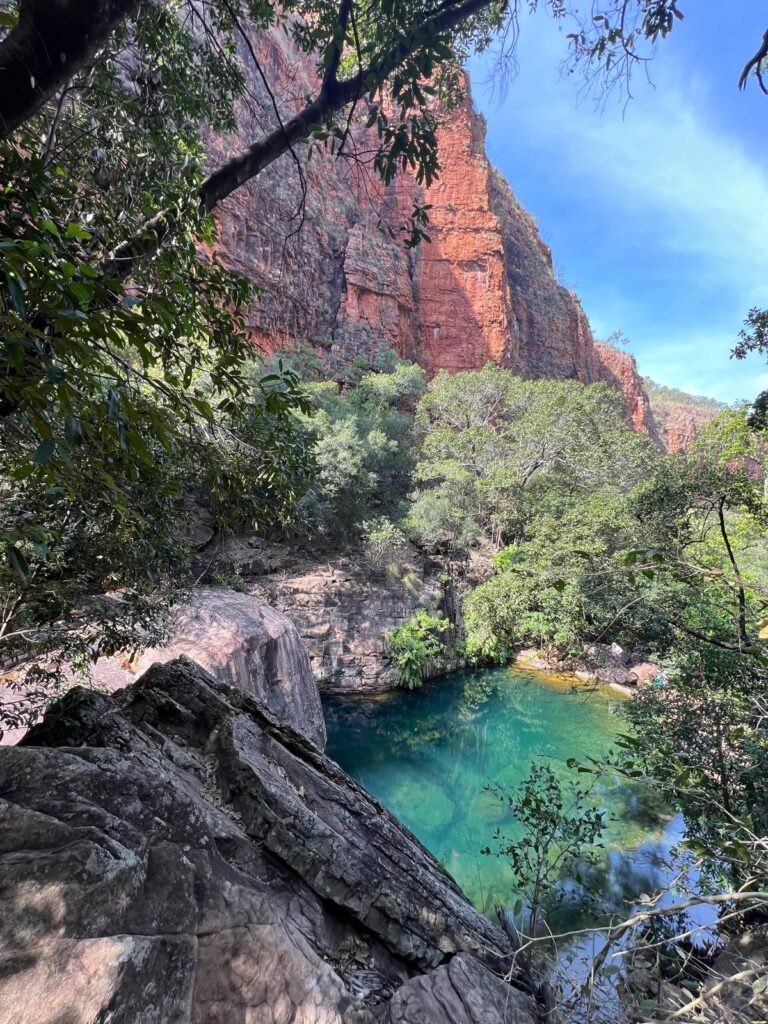 Auf dem Rückweg zum Highway 1 liegt ein großer Wasserfall, der Emma Gorge. Nach einer 30 minütigen Wanderung erreichten wir ein erfrischendes Wasserbecken, was wir auch direkt zu einer Abkühlung nutzen. Nach einem kurzen Frühstück in wunderschöner Natur, ging es zurück zum Auto und wir starteten Richtung Darwin in den Norden.
