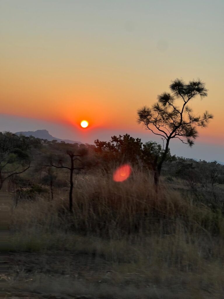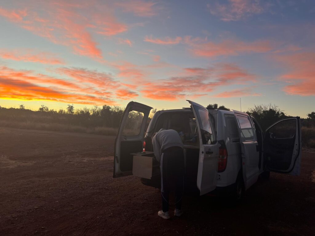 Am Morgen des 23. Mai machten wir uns auf den Weg Richtung Kununurra. Da wir die bevorstehenden 11 Stunden Fahrt nicht an einem Tag bewältigen wollten, planten wir einen Zwischenstopp nach circa 600km am Eingang des Purnululu Nationalparks ein. Hier kamen wir sogar noch im Hellen an und konnten nach der langen Fahrt noch einen schönen Sonnenuntergang genießen.