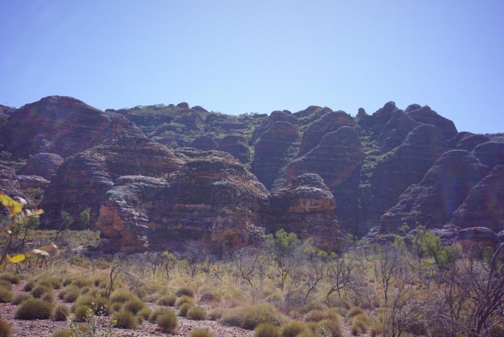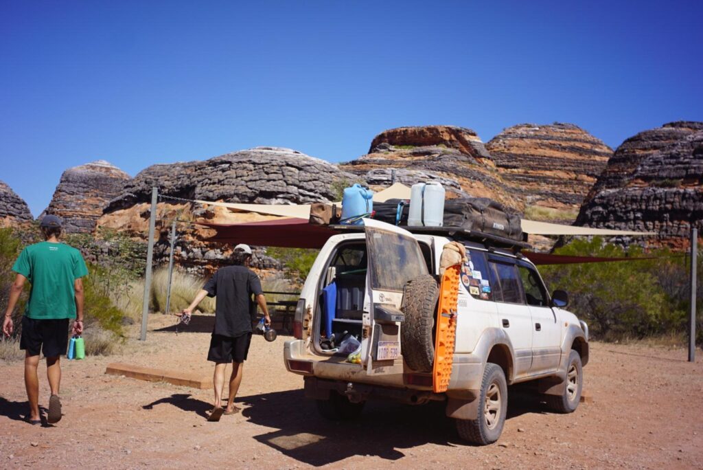 Gerade aufgewacht, konnten wir aus dem Dachzelt direkt neben uns deutsche Stimmen hören. Die zwei Jungs, Valentin und Simon, sind noch ziemlich spät am Vorabend auf dem Rastplatz angekommen und wir kamen direkt ins Gespräch. Sie waren bereits in der Gegend rund um Kununurra und berichteten uns von abenteurlichen Fahrten mit ihrem Allrad (4 weel drive = 4WD) Auto auf unbefestigten Straßen. Im gleichen Zuge sagten sie uns, dass man den Purnululu Nationalpark ebenfalls nur mit einem 4WD Fahrzeug besichtigen kann und boten uns daher netterweise an, mit ihnen mitzukommen. Da wir ohnehin keinen Zeitdruck hatten und die Jungs wieder zu dem Parkplatz zurückfahren mussten, zögerten wir nicht lange und sagten zu! Kurze Zeit später saßen wir auf der Rückbank des 25 Jahre alten Toyotas mit über 500.000 Kilometern auf dem Tacho und fühlten uns zurück versetzt zu den steinigen Hoppelfahrten in Laos! 😂 Es ging wortwörtlich über Stock und Stein und durch mehrere Wasserlöcher bis tief in den Nationalpark hinein. Das Highlight des Parks sind die 250 Meter hohen Bungle Bungle Felsformationen, die schon mehr als 350 Millionen Jahre alt sind. Der Anblick war wirklich atemberaubend und definitiv ein Highlight von Nord Australien. Wir vier verstanden uns super gut und hatten einen tollen spontanen Tag und mussten uns leider nach circa fünf Stunden wieder voneinander verabschieden.