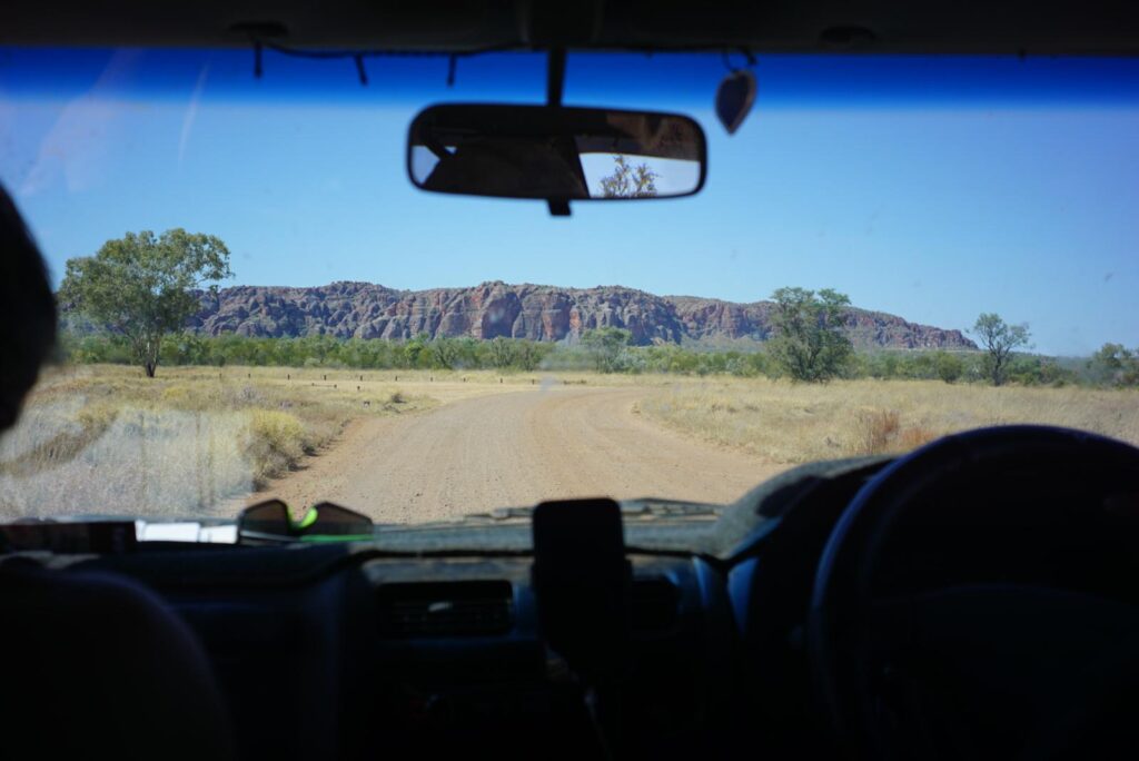 Auf Empfehlung von den zwei Jungs ging es für uns am nächsten Tag nach einem kurzen Abstecher in Kununurra auf die nahegelegene Gibb River Road. Hier führen von der asphaltierten Hauptstraße mehrere unbefestigte Wege ab, die man mit einem 4WD Fahrzeug erkunden kann – was für uns leider ausblieb. Trotzdem konnten wir knappe 150km in das Gebiet hineinfahren und die tolle Landschaft genießen.