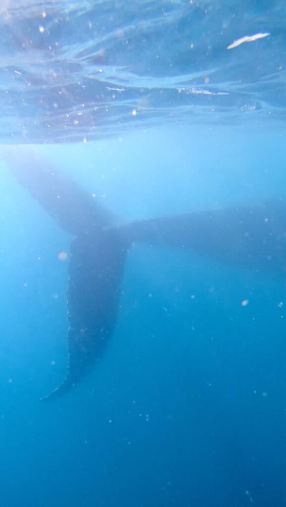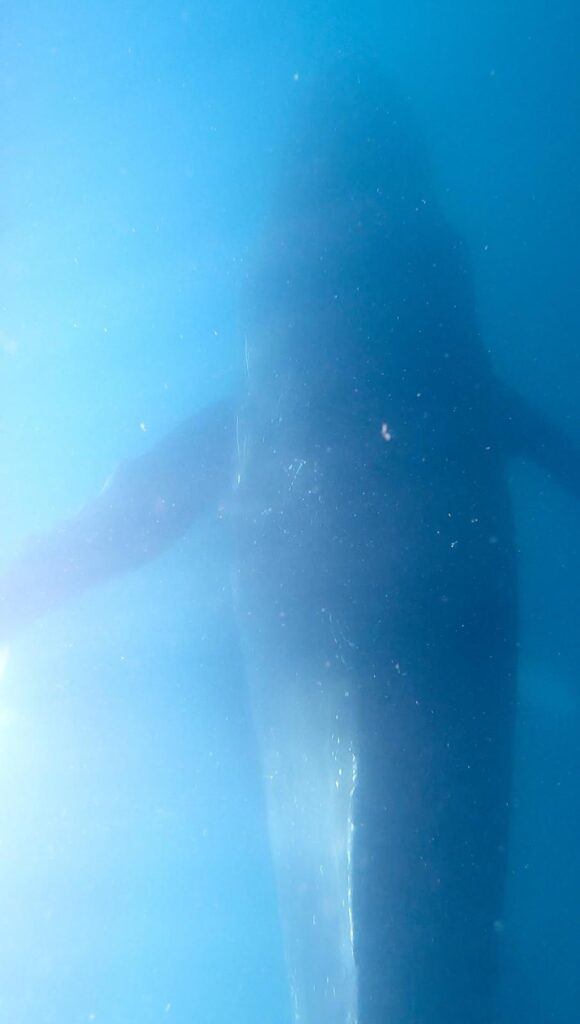 Das ließen wir uns nicht zweimal sagen! In dem eher provisorischen kurzen Neoprenanzug war es EISKALT. 🥶 Aber egal, da mussten wir jetzt einmal durch. Beim Eintauchen ins Wasser bliebt uns allerdings nicht nur wegen der Kälte kurz der Atem weg. Direkt tauchte ein 12 Meter langes Weibchen unter unseren Köpfen hindurch. Wir konnten es gar nicht glauben. 🐋😍 Anschließend beobachteten wir sie noch eine ganze Weile vom oberen Deck aus.